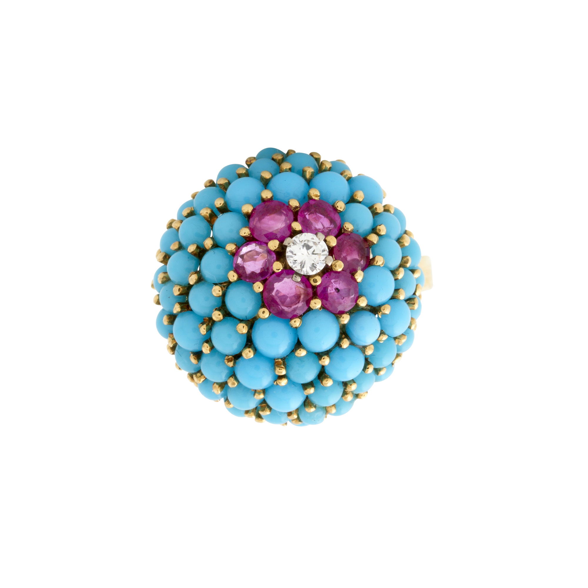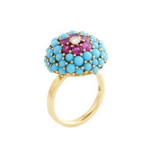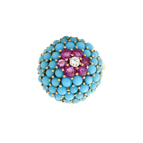 Of bombe cluster design, featuring a bead-set round brilliant-cut diamond within a surround of six bead-set circular-cut rubies and a further surround of turquoise cut en cabochon, the diamond weighing approximately 0.15 carats, the rubies together weighing approximately 0.90 carats, size P, gross weight approximately 10.7 grams.