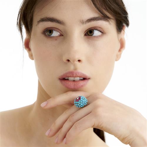 18CT GOLD, DIAMOND, RUBY AND TURQUOISE RING