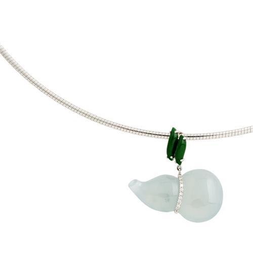 Terminating in carved pale bluish jadeite, surmounted by two claw-set dark green jadeite between a pavé-set diamond connector, supported by a reversable omega chain, mounted in 18ct gold, inner circumference 450mm, gross weight approximately 14.0 grams.