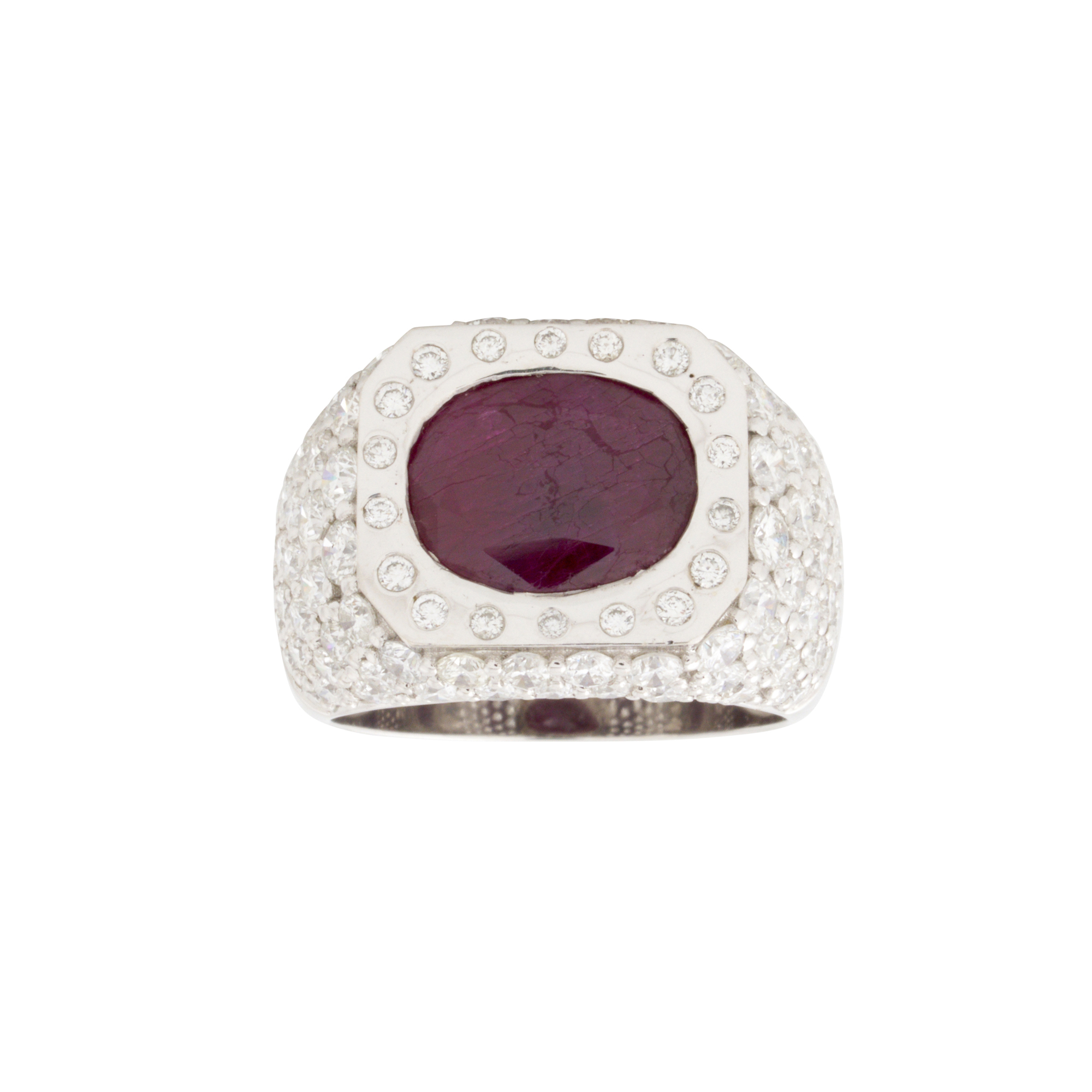 Centring a rubover-set oval-cut ruby weighing approximately 4.00 carats, within an octagonal surround of rubover-set brilliant-cut diamonds and a raised surround with shoulders and underbezel pavé-set with further brilliant-cut diamonds, the diamonds together weighing approximately 3.80 carats, size M-N, gross weight approximately 9.3 grams.