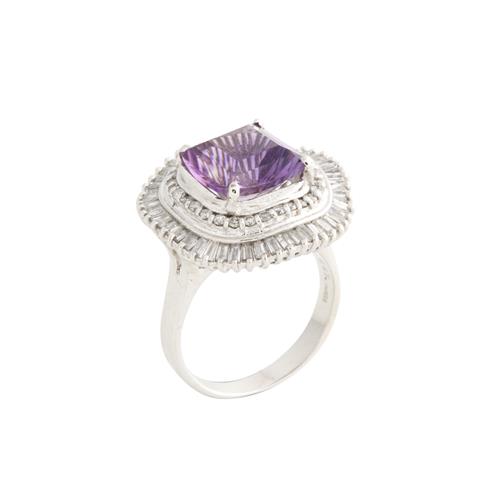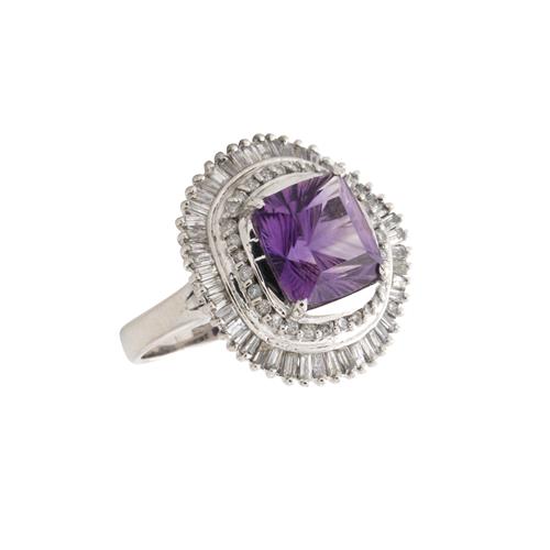 Of cluster design, centring a corner claw-set step cushion-cut amethyst weighing approximately 6.40 carats, within a surround of claw-set round brilliant-cut diamonds and a further undulating surround of claw-set baguette-cut diamonds, the diamonds together weighing approximately 0.99 carats, size P, gross weight approximately 16.3 grams.