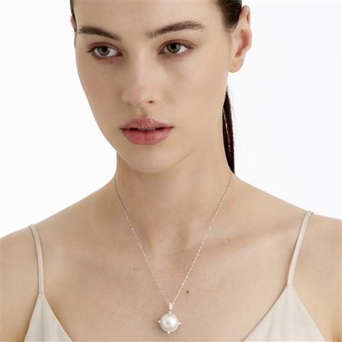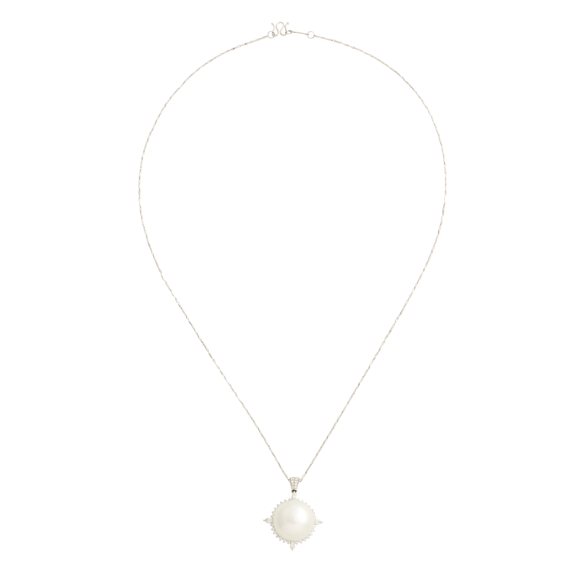 Of cluster design, centring a round pearl of white hues measuring approximately 15.6mm, within a surround of claw-set round brilliant and marquise-cut diamonds, to a bale detailed with further round brilliant-cut diamonds, the diamonds together weighing approximately 0.60 carats, to a fine fancy link chain completed by a hook clasp, pendant length 30mm, chain length 460mm, gross weight approximately 11.7 grams.