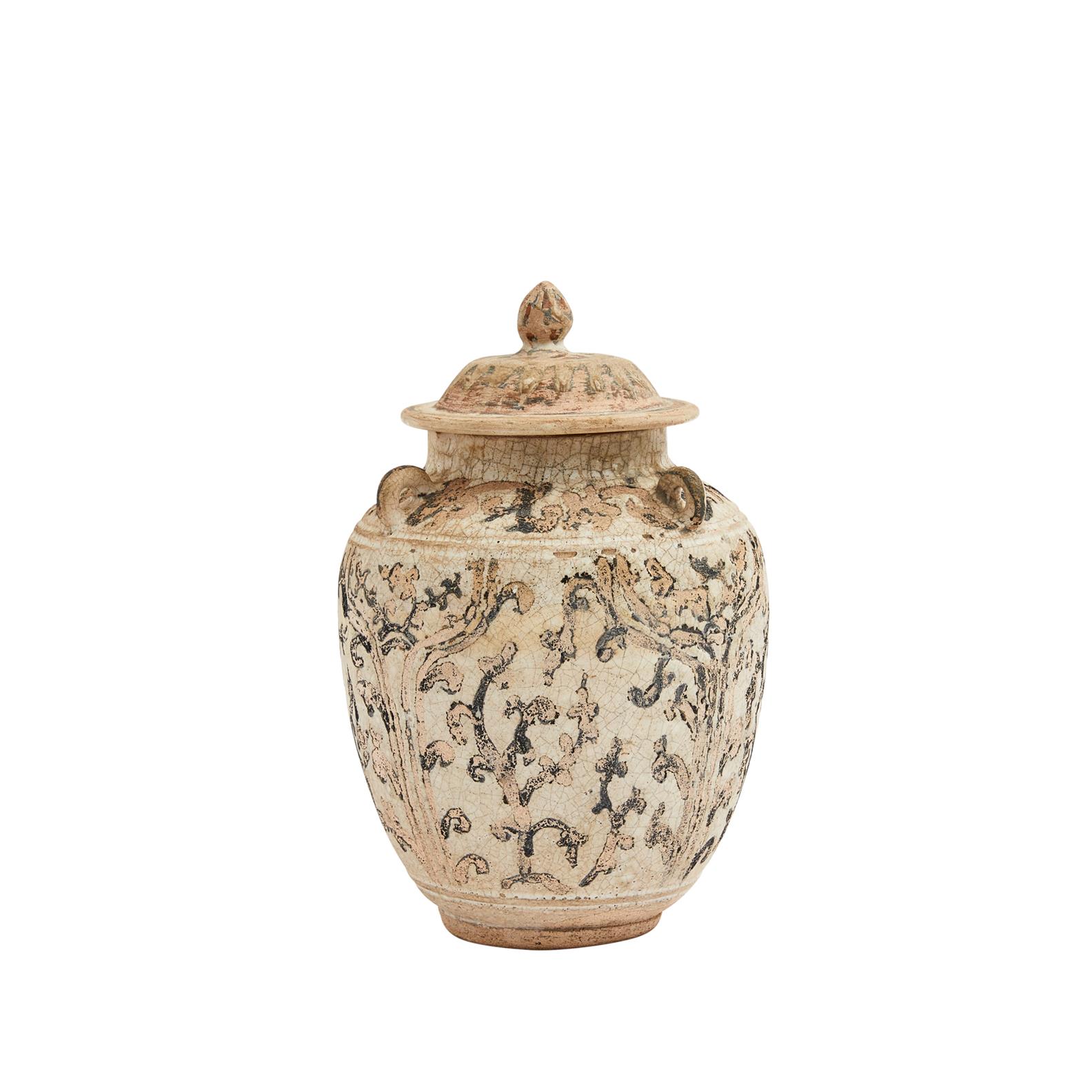Of baluster form with a domed cover surmounted by a knop finial, the shoulders set with a pair of lug handles, the body finely decorated in a dark pigment with stylised scrolling foliate motifs.