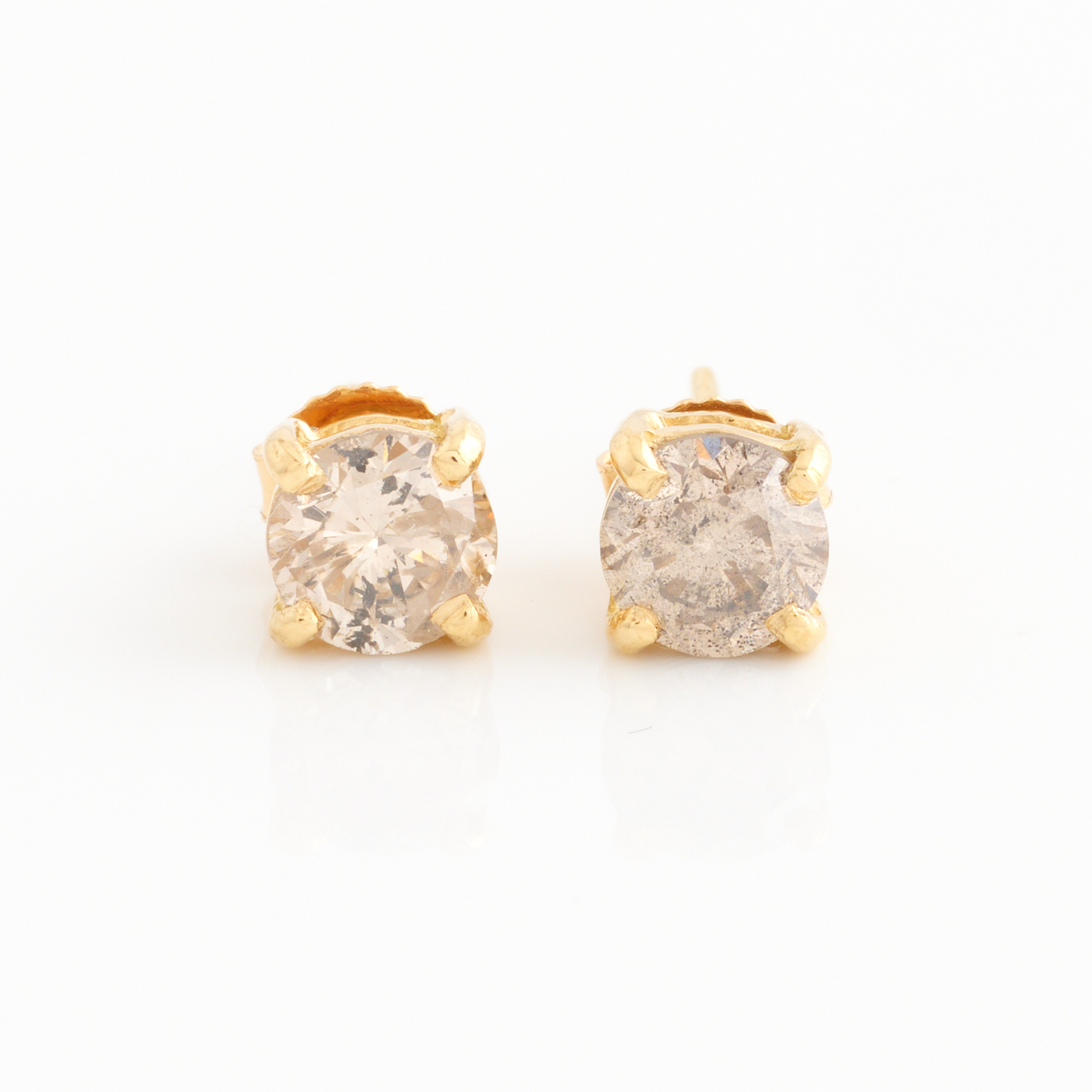 A PAIR OF CHAMPAGNE DIAMOND EARRINGS IN 18CT YELLOW GOLD, THE DIAMONDS TOTALLING 1.68CT, TO POST AND BUTTERFLY FITTINGS, 1.79GMS, ACCOMPANIED BY A VALUATION