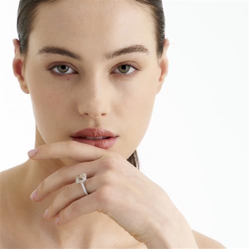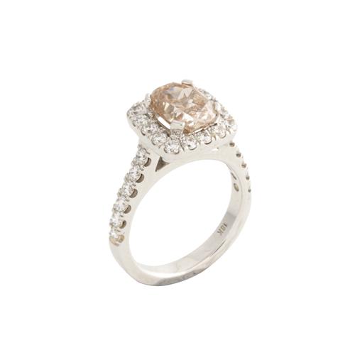 Of cluster design, centring a claw-set oval-cut champagne diamond weighing approximately 2.10 carats, within a square surround and shoulders detailed with claw-set round brilliant-cut diamonds together weighing approximately 0.84 carats,