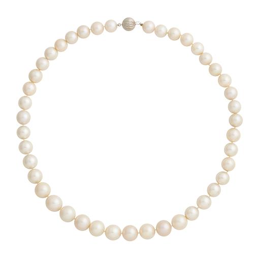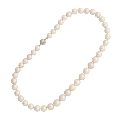 Comprising forty-three graduating near round pearls of silver and and white hues measuring approximately 11.3mm to 14.1mm, completed by ball clasp in 18ct white gold, length 590mm.