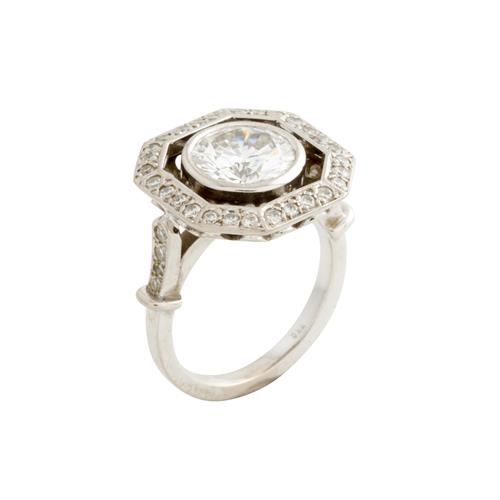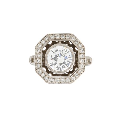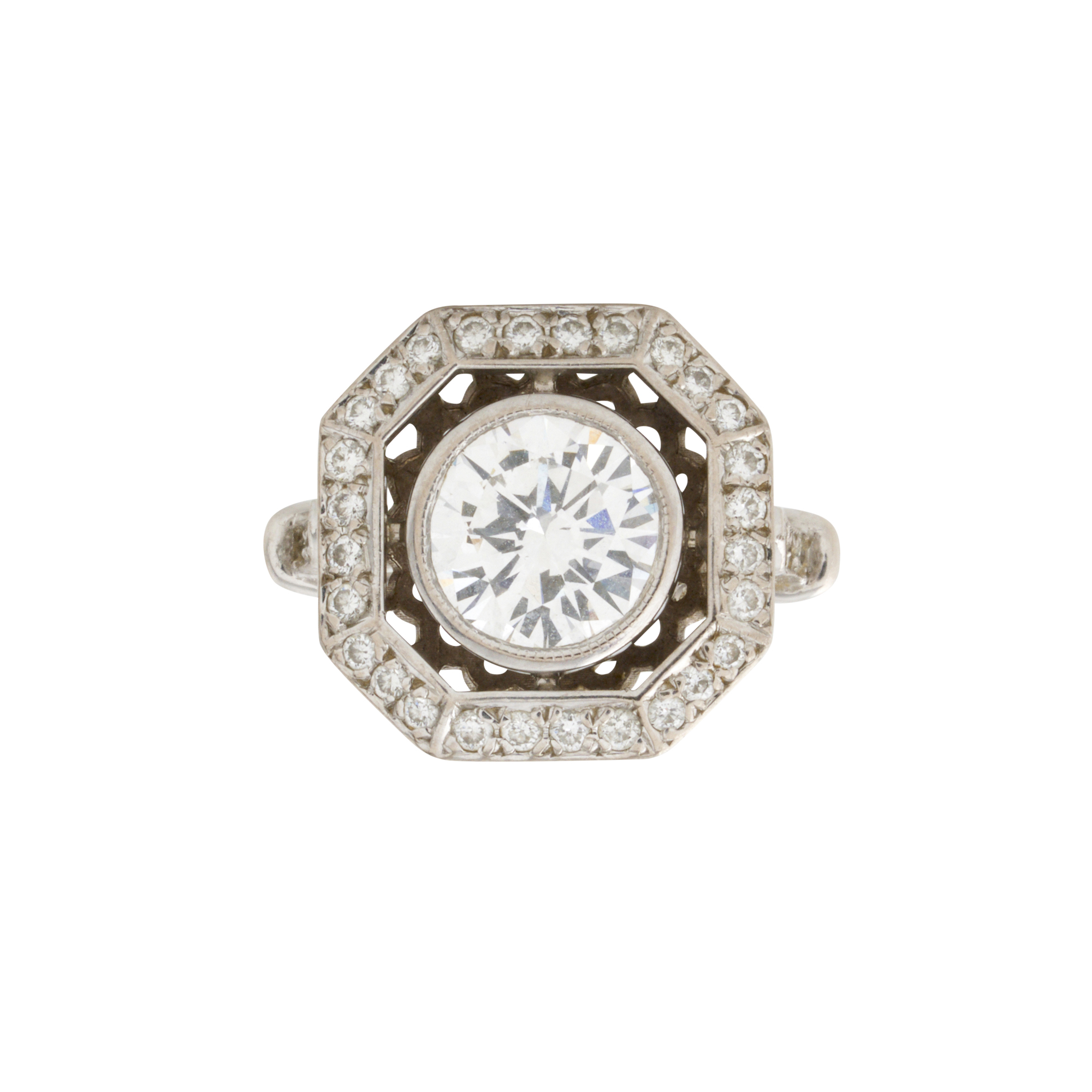 Centring a bezel-set round brilliant-cut diamond weighing 2.00 carats, within an octagonal surround and shoulders detailed with further brilliant-cut diamonds, size I, gross weight approximately 6.7 grams.