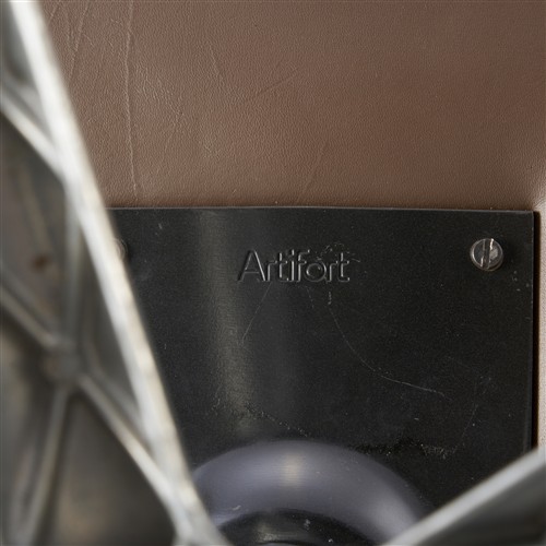 Padded seating and armrests in brown leather with aluminium five point base. Manufacturer mark to underside.