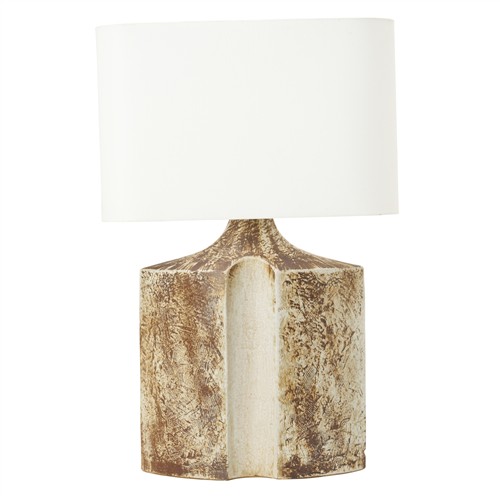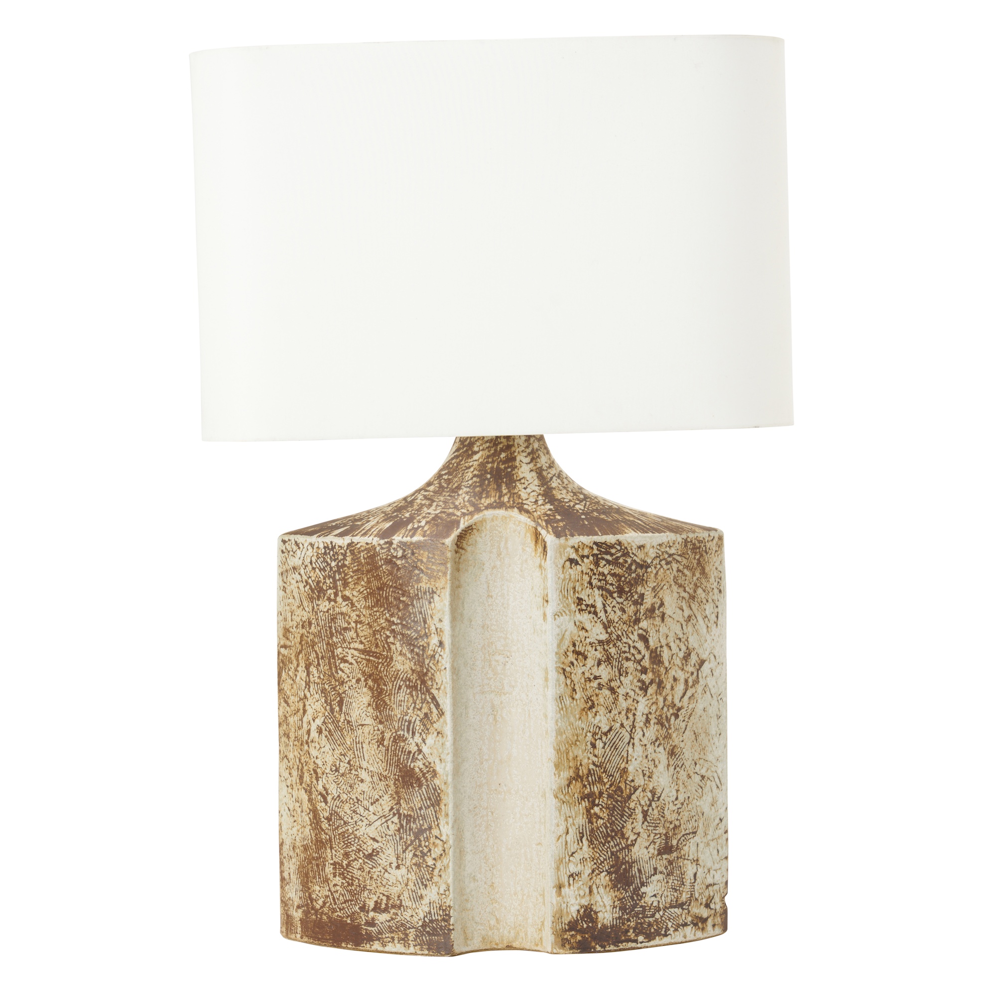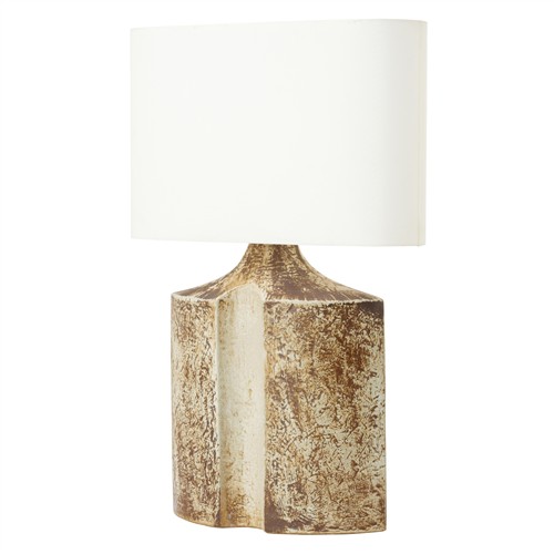Stoneware bottle form with incised textural finish and central linear concave element to both sides. Ellipse fabric shade.