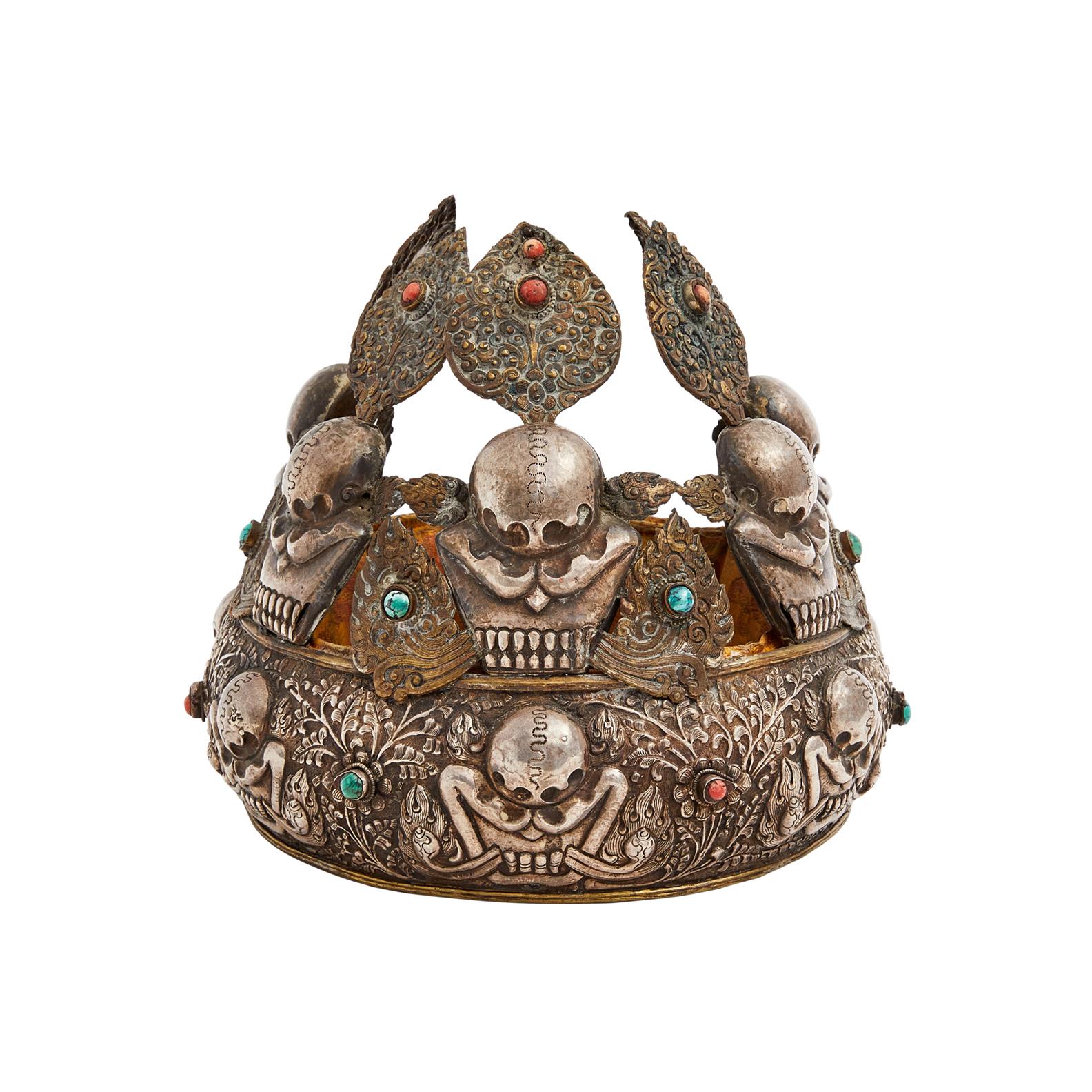 Comprising a silver crown with elaborate repousse decoration on each element of the crown, with five citipati skull heads each with an insert of a leaf-shaped attachment gilded and with coral insets, the lower section with a further array of skull heads and with turquoise insets, a brocade padded headpiece facilitating wear on the interior.