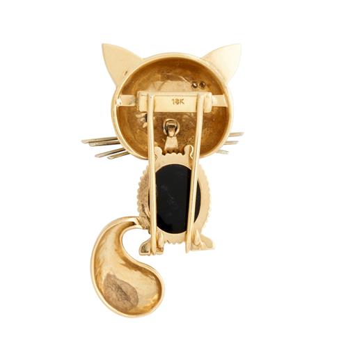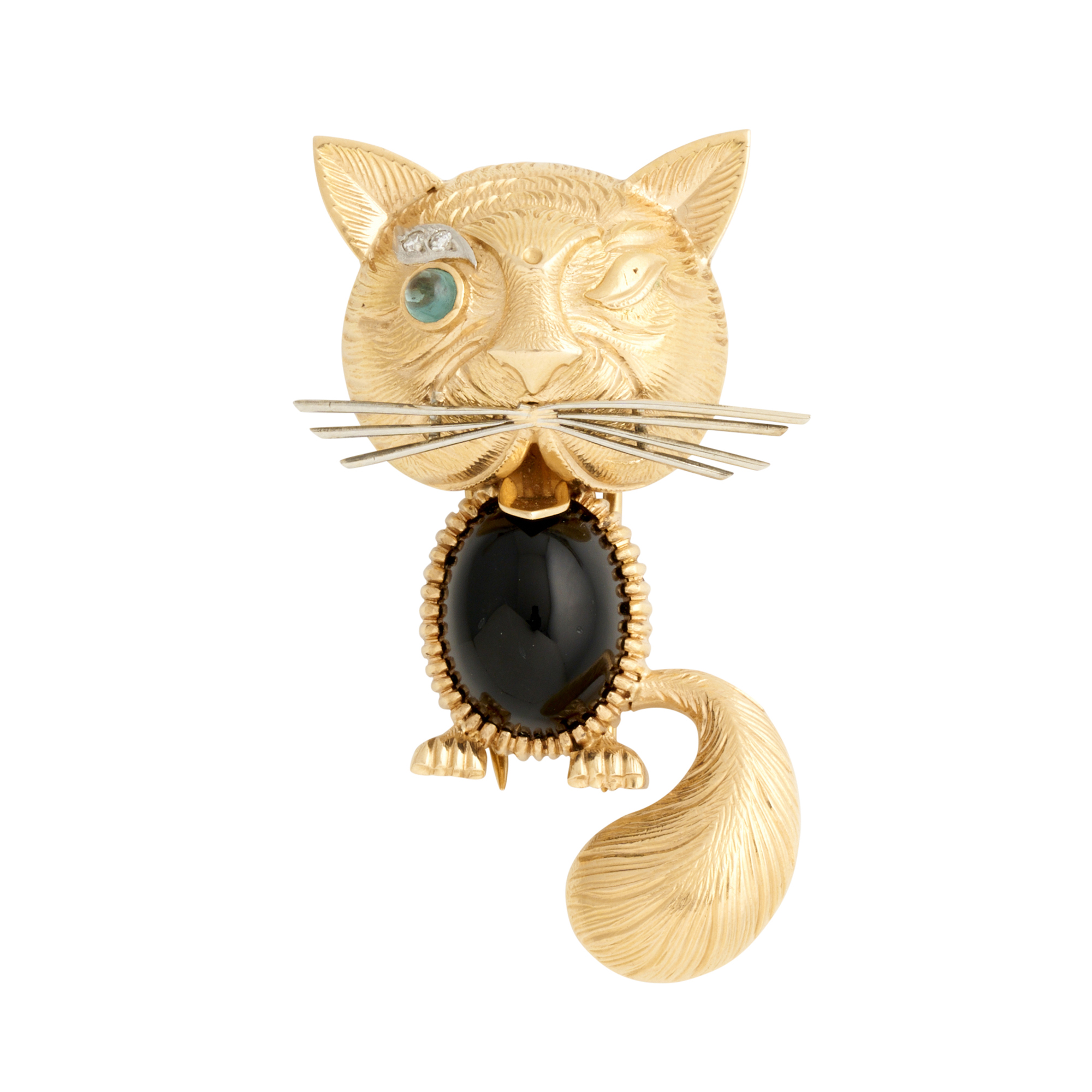 Modelled as a winking cat, the body set with an oval onyx cut en cabochon, the eye set with a bezel-set circular tourmaline cut en cabochon and the eyebrow detailed with two single-cut diamonds, length 48mm, width 28mm, gross weight approximately 17.2 grams.