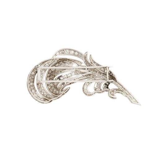 Modelled as a plumed feather, the centre channel-set with baguette-cut diamonds, the surround pavé-set throughout with single-cut diamonds, the diamonds together weighing approximately 3.00 carats, length 70mm, width 36mm, gross weight approximately 19.5 grams.