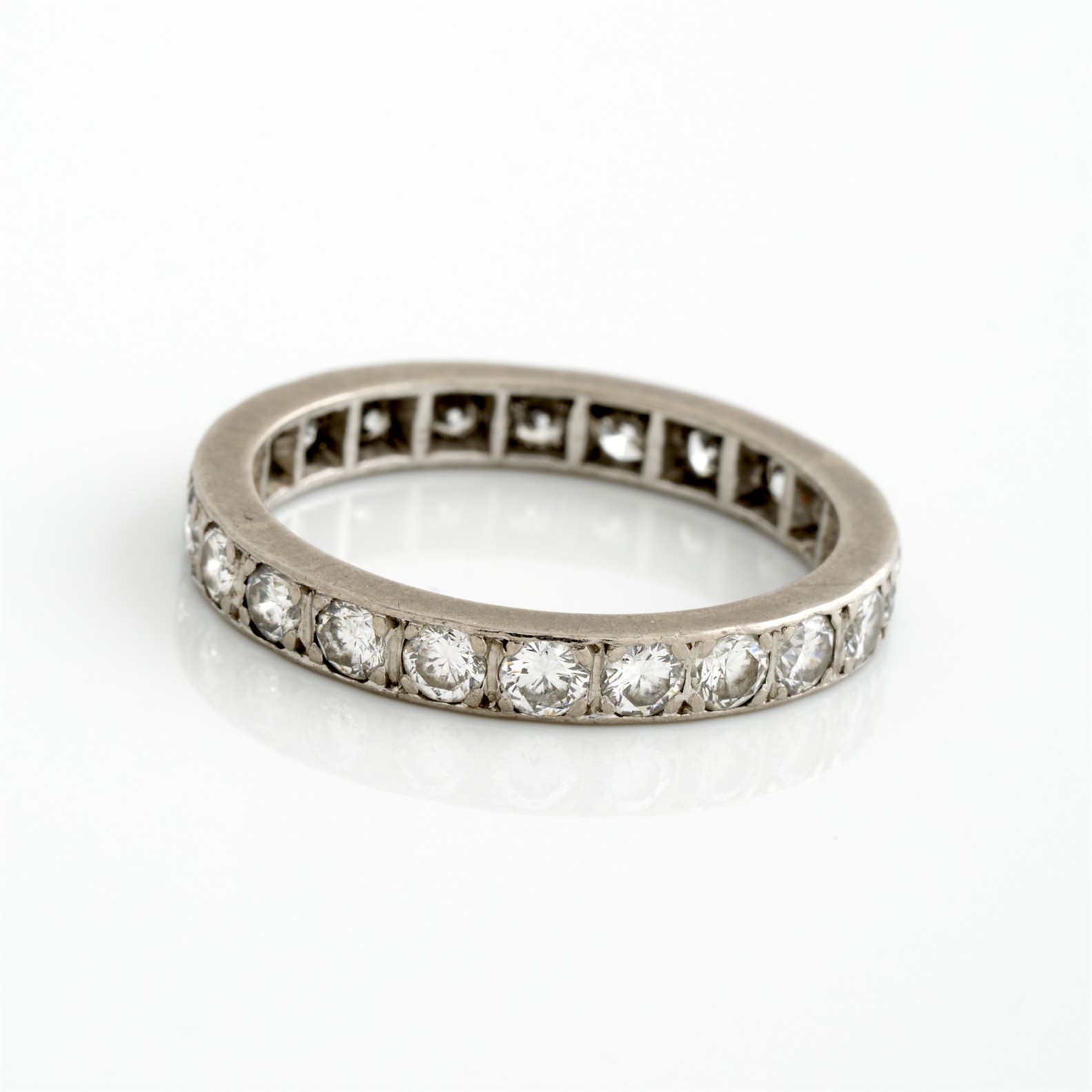 A DIAMOND ETERNITY RING IN LOW CARAT WHITE GOLD, DIAMONDS TOTALLING APPROXIMATELY 0.88CTS, SIZE N, 2.4GMS