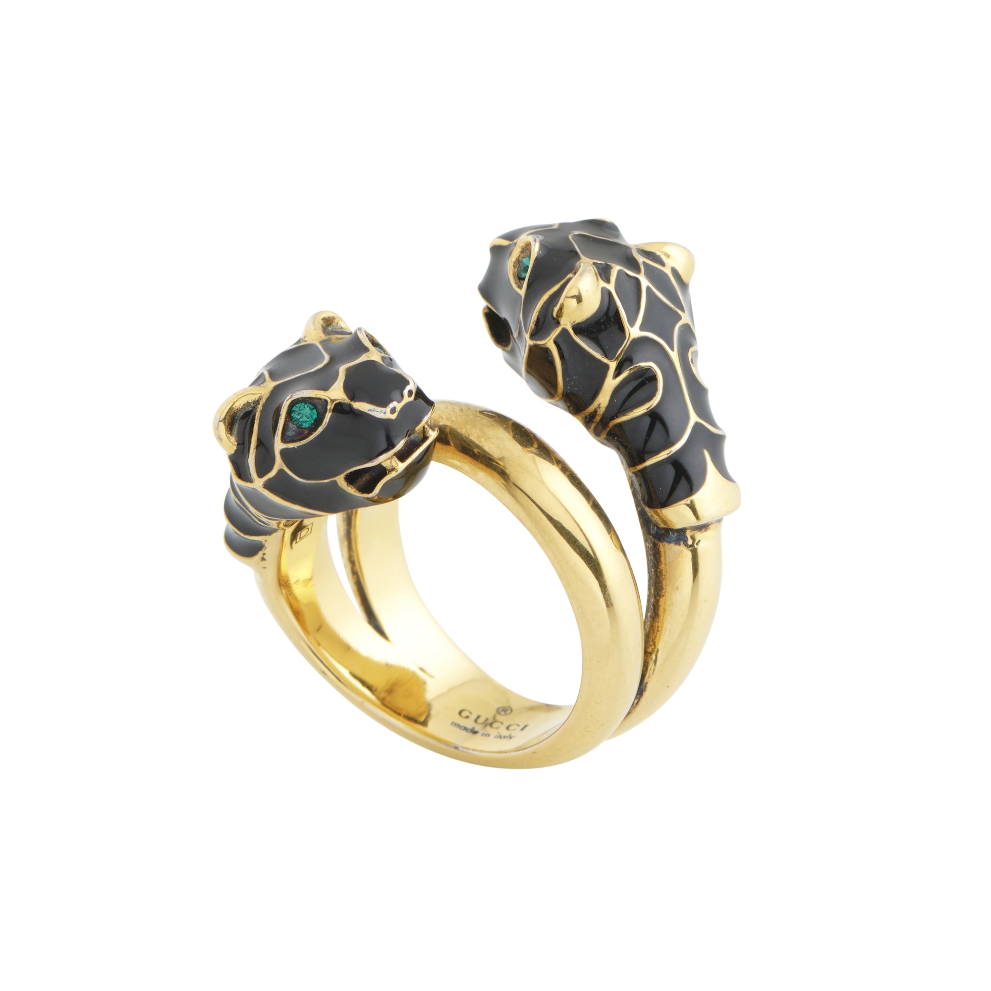 Styled in gold tone hardware with black enamel, sculpted as a duo of panther heads with green gem eye accents, measures size K.