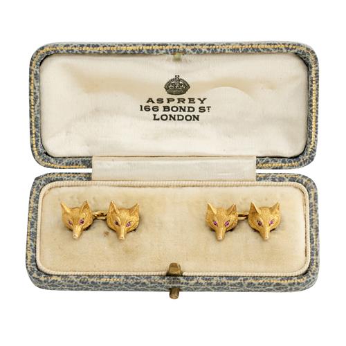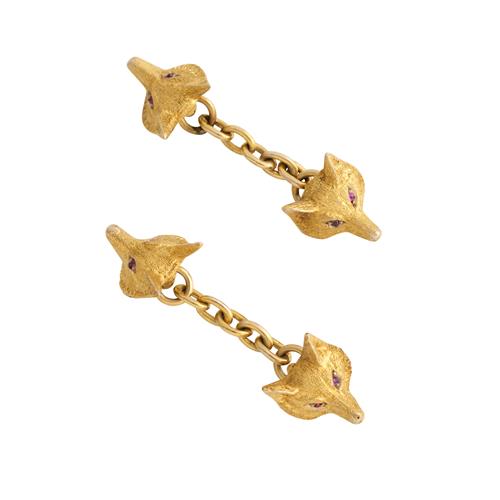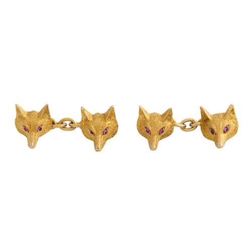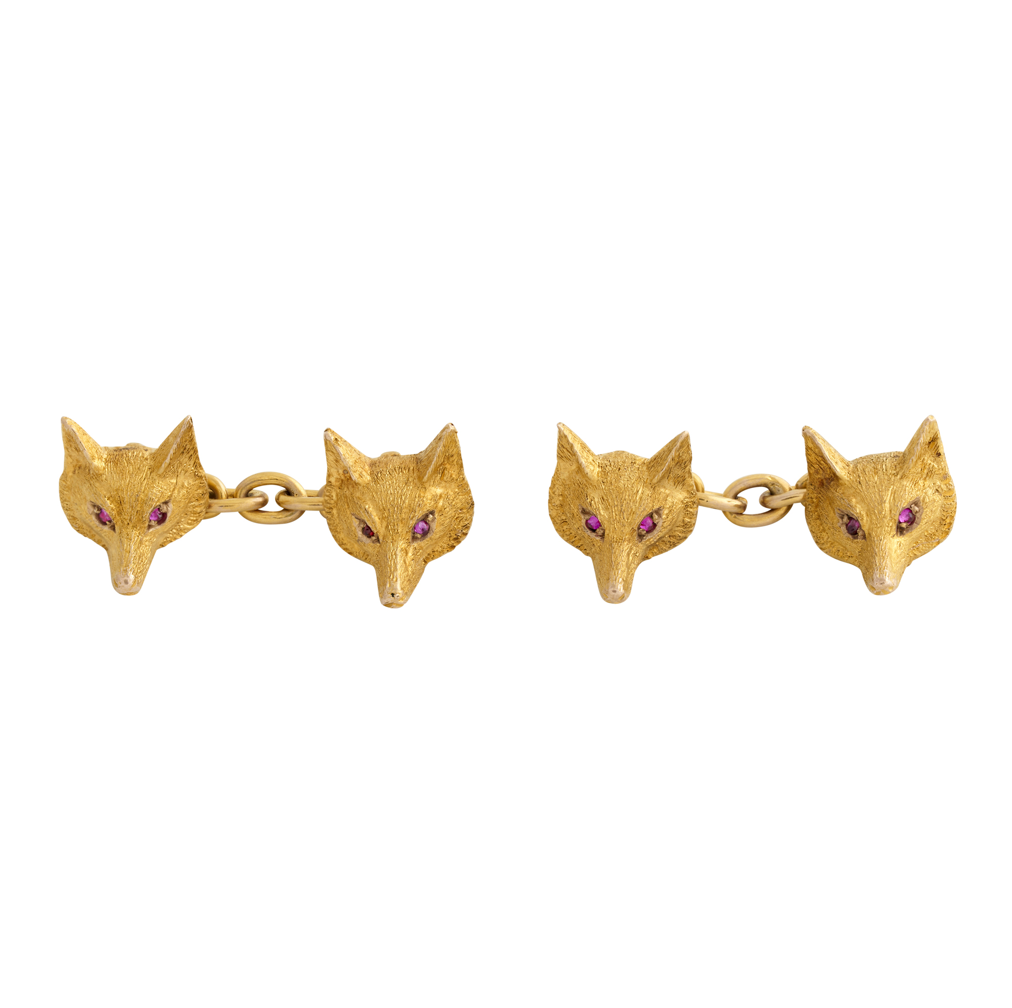 Each cufflink modelled as a pair of fox heads with chain connectors, the eyes detailed with a sugarloaf-cut garnets, British hallmarks, gross weight approximately 6.7 grams.