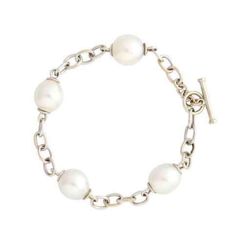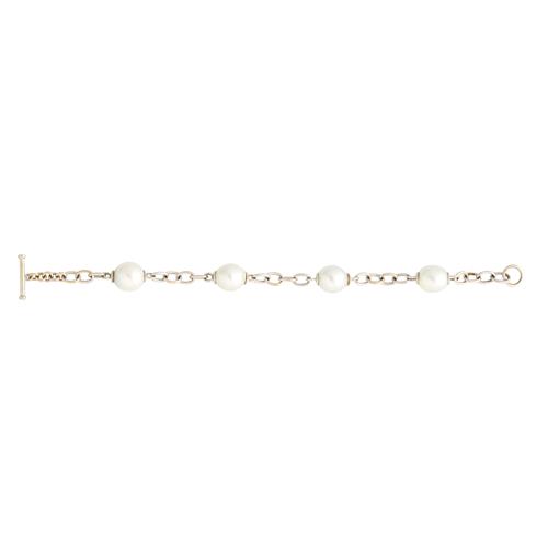 The cable link bracelet, set at intervals with four semi-baroque pearls of while hues measuring approximately 12.1mm to 12.6mm, completed by a toggle clasp with diamond terminals, length 210mm, gross weight approximately 23.3 grams.