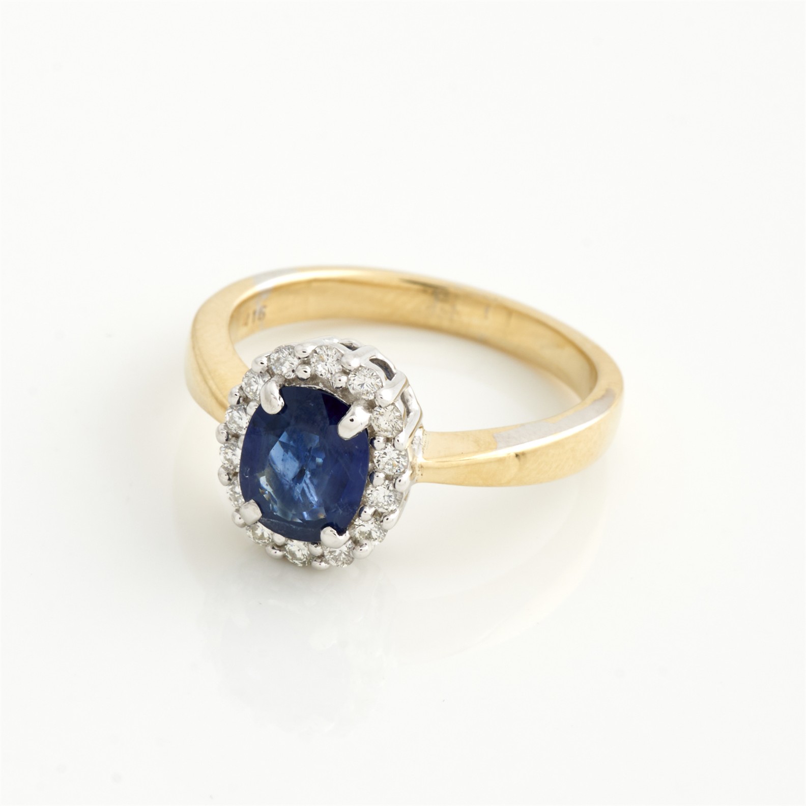A SAPPHIRE AND DIAMOND RING IN TWO-TONE 18CT GOLD, SIZE M1/2, 3.6GMS
