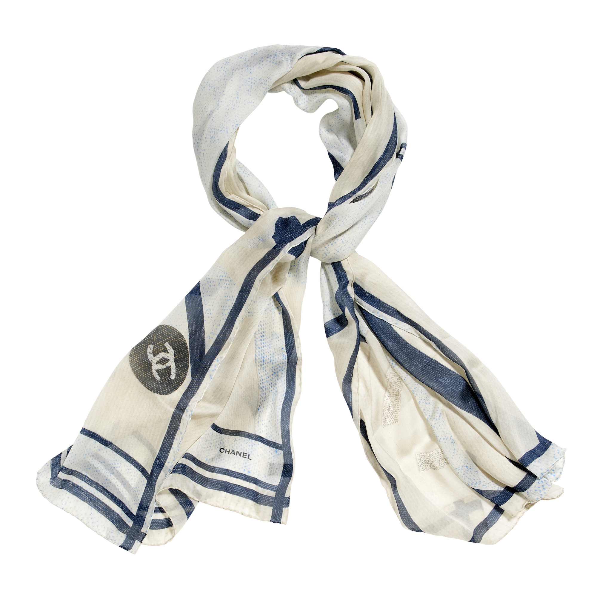 Styled is silk featuring graphic design in shades of navy and cream, accented with multiple 'CC' logos, measures 180 x 67 cm.