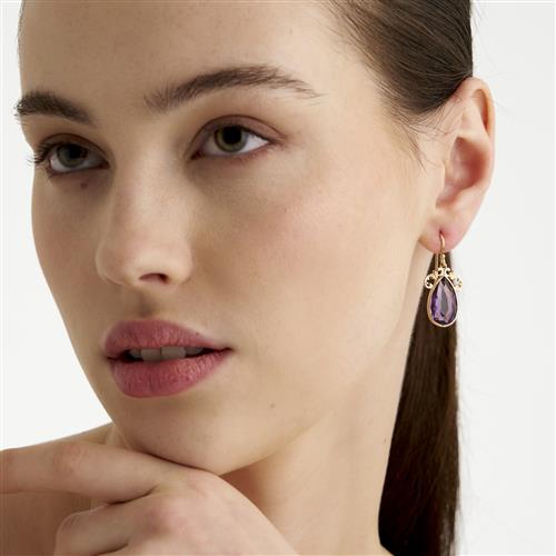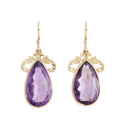 Each earring featuring a bezel-set pear shaped amethyst to a decorative surmount, the amethysts together weighing approximately 12.0 carats, to shepherd hook fittings, length 35mm, gross weight approximately 5.8grams.