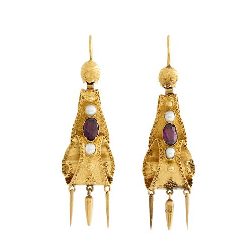 PAIR OF 18CT GOLD, GARNET AND PEARL EARRINGS, CIRCA 1890