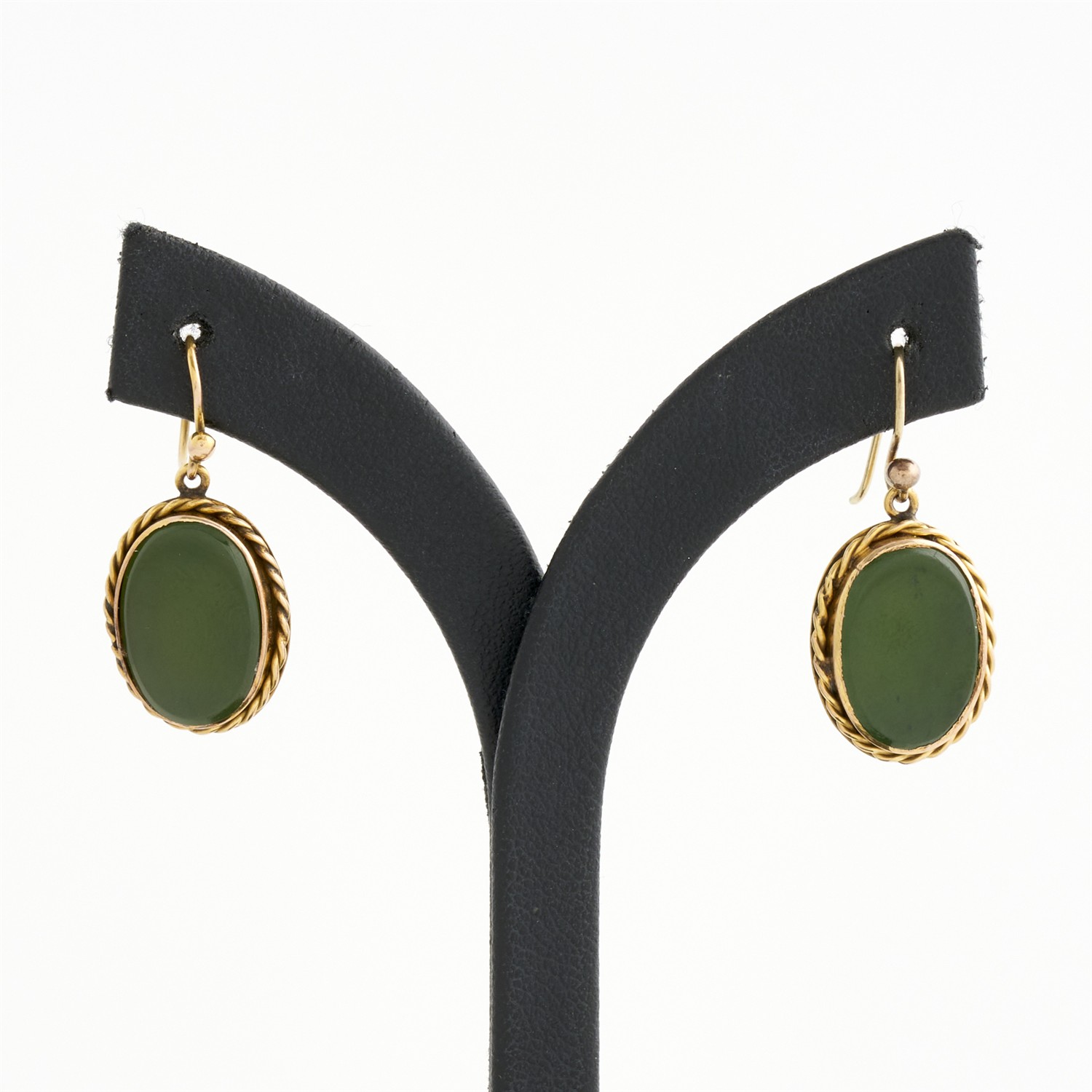 A PAIR OF AGATE EARRINGS IN 9CT GOLD, TO SHEPHERD HOOK FITTINGS, 30MM, 4.8GMS, ACCOMPANIED BY A FITTED KOZMINSKY BOX