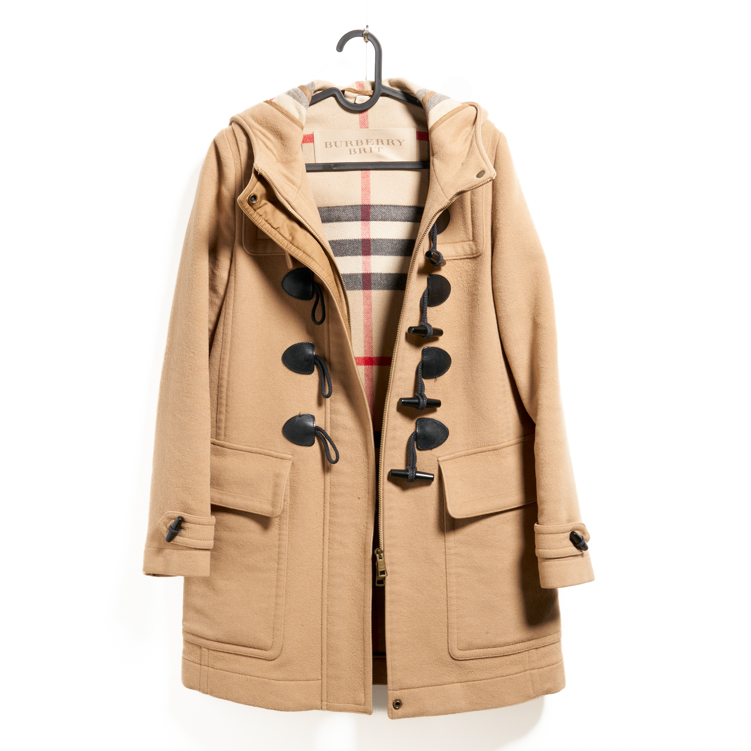 BURBERRY, A WOOL BLEND DUFFLE COAT STYLED IN CAMEL, BURBERRY CHECK PRINT INTERIOR, MARKED SIZE 6.