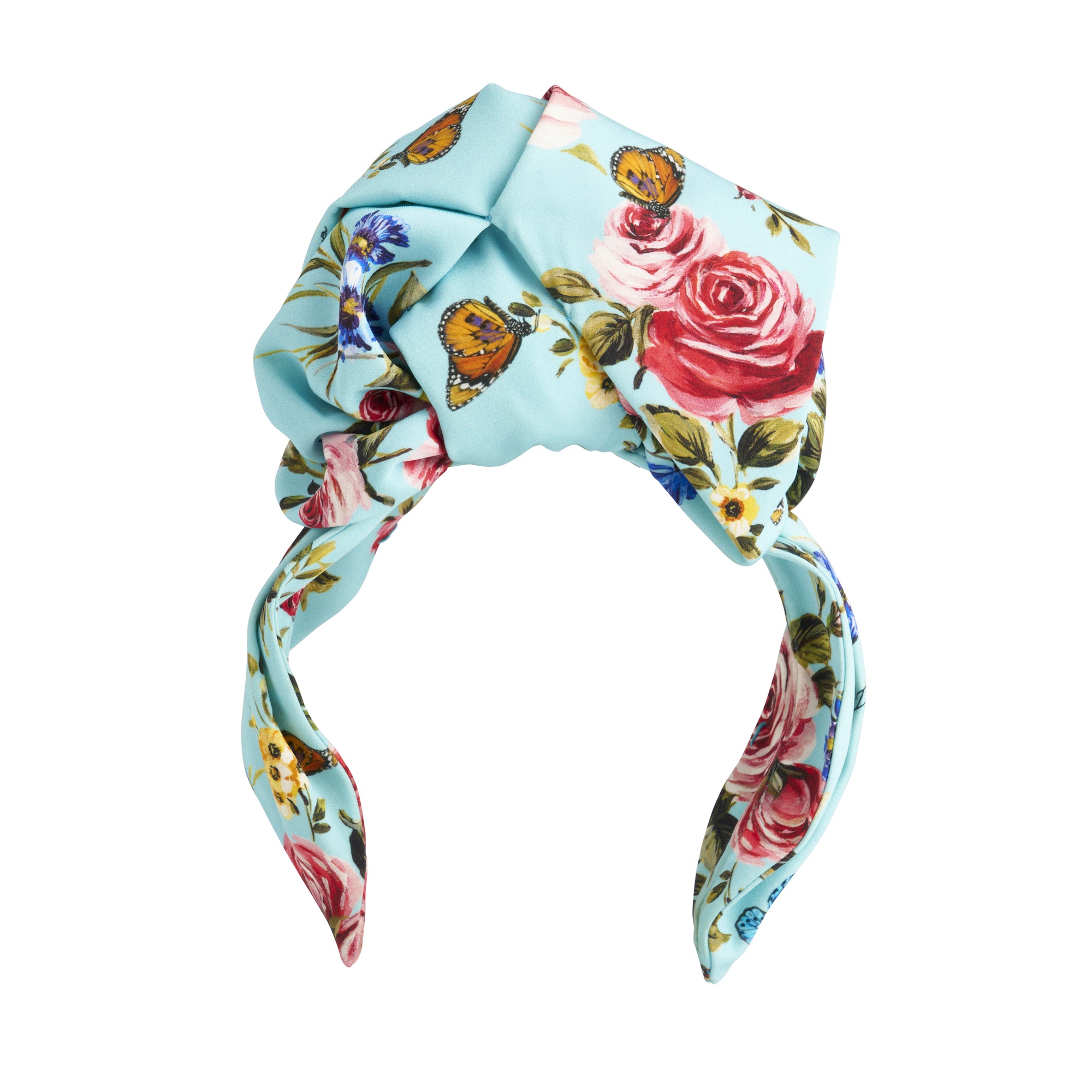 Styled in multicoloured silk featuring floral and butterfly print, designed with sculptural bow at the crown.