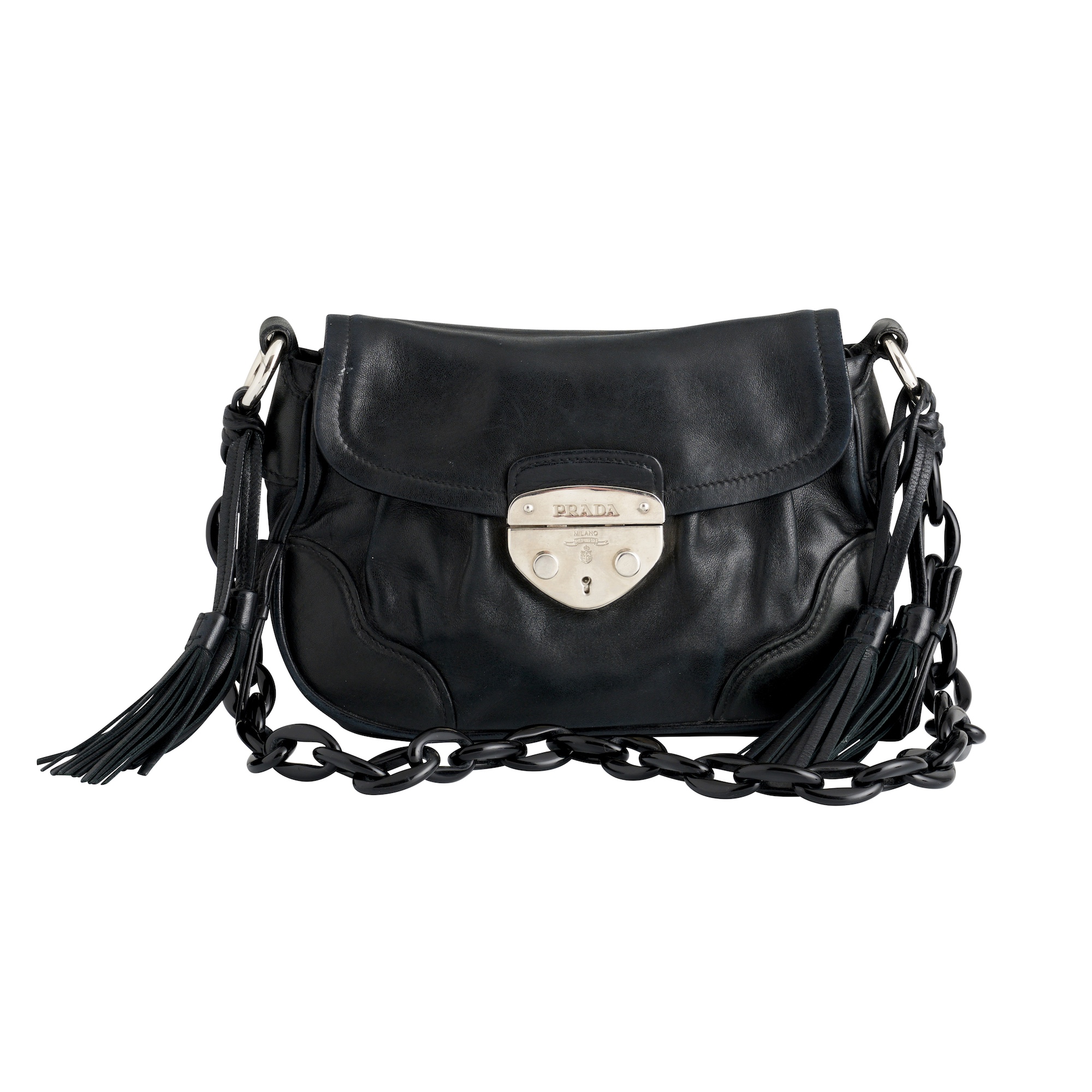 Styled in black lambskin with silver tone hardware, featuring composite black chain strap and leather tassel charm detail, measures 17 x 24 x 8 cm.
