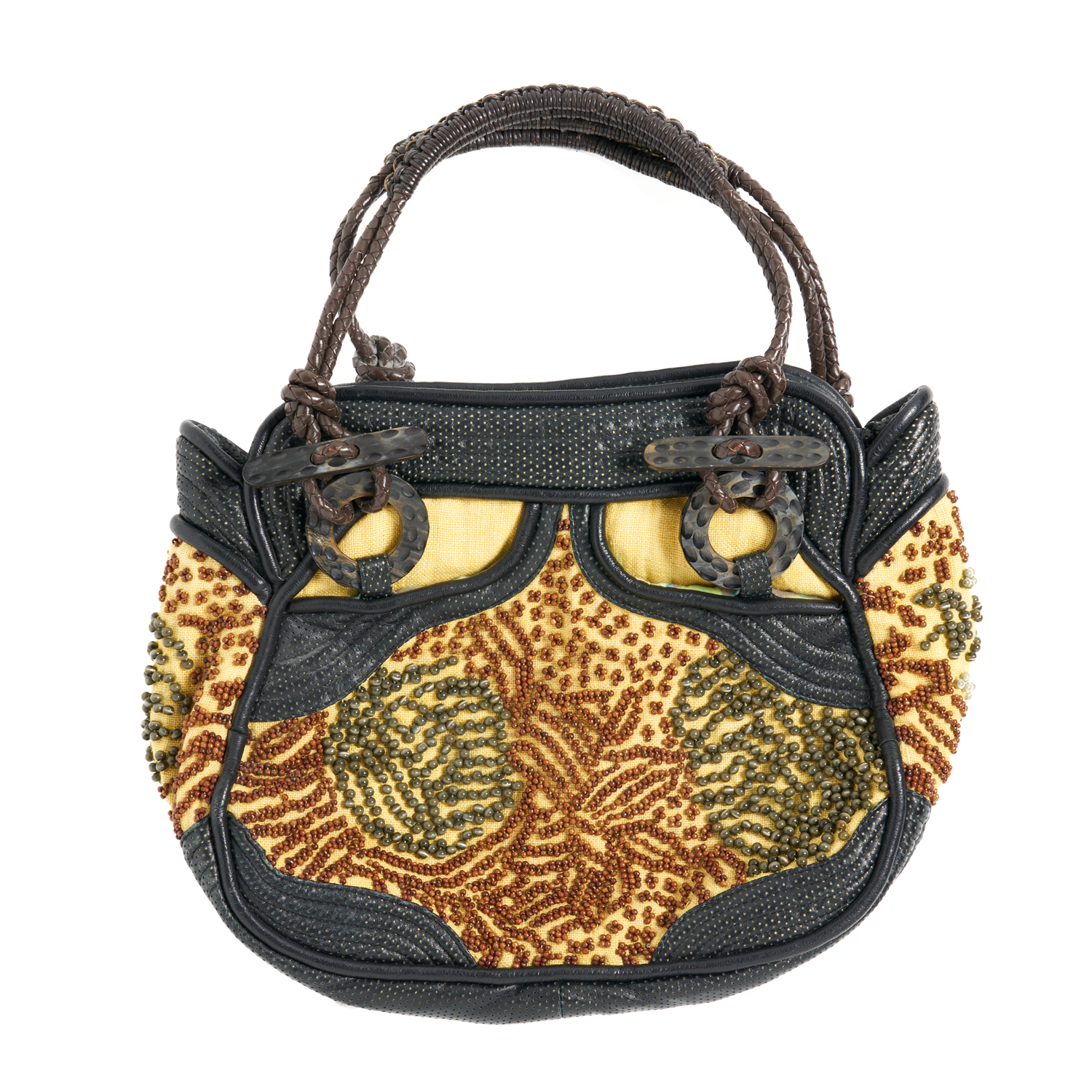 JAMIN PUECH, A HANDBAG STYLED IN BEADED YELLOW COTTON WITH PERFORATED LEATHER TRIM AND BRAIDED LEATHER HANDLES FEATURING WOOD DETAILS, 28 X 32 X 12 CM.