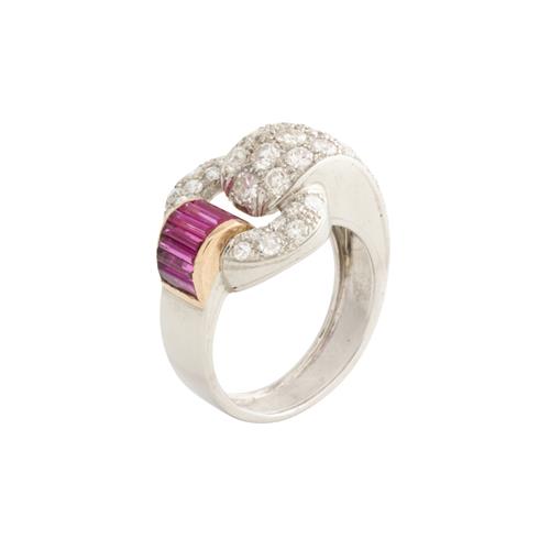 Of retro design, pavé-set throughout with old European-cut and single-cut diamonds, and channel-set with baguette-cut synthetic ruby detail, size K, gross weight approximately 6.3 grams.