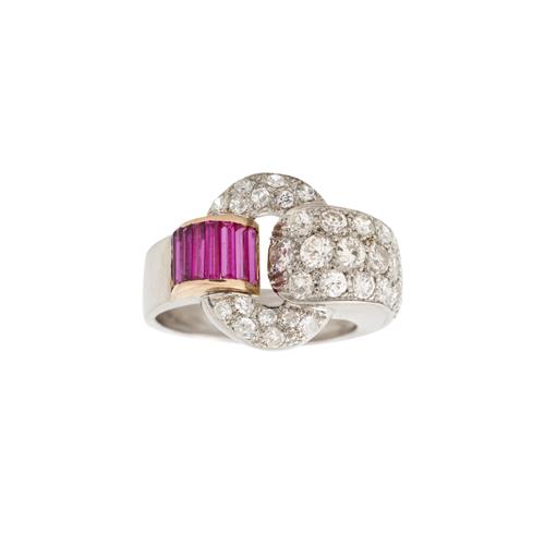PLATINUM, 18CT GOLD, DIAMOND AND GEM-SET RING, CIRCA 1940