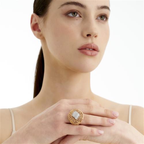 Of domed design, centring a diamond shaped panel pavé-set round brilliant-cut diamonds within an openwork textured surround, Italian marks, size K, gross weight approximately 15.2 grams.