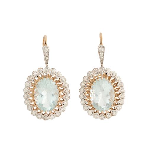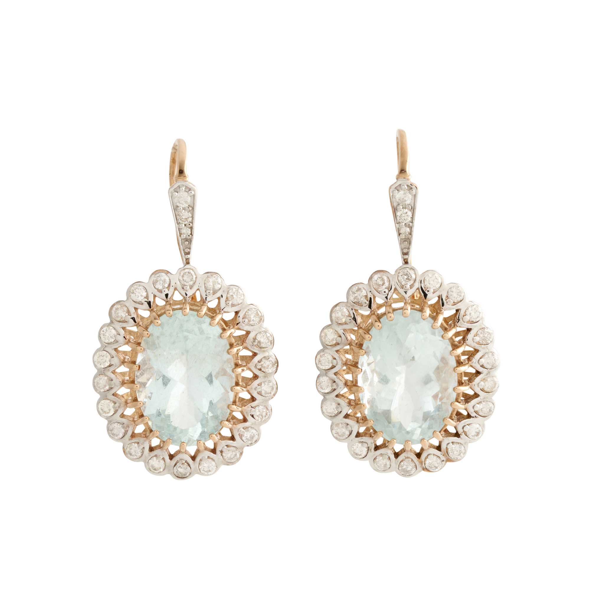 PAIR OF 14CT TWO-TONE GOLD, AQUAMARINE AND DIAMOND EARRINGS