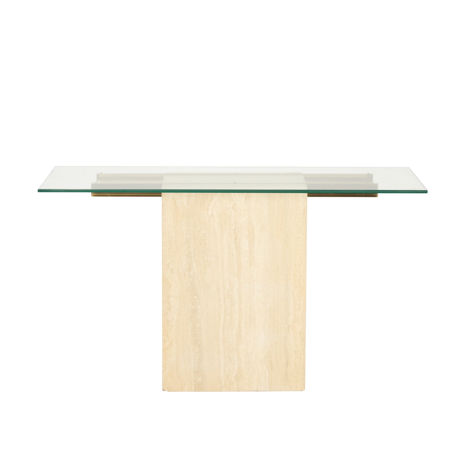 Hollow travertine base with two brass horizontal supports and rectangular glass top.