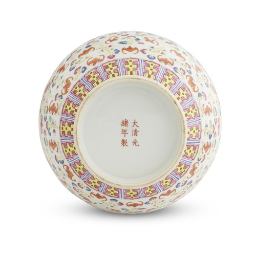 The vase is decorated with a dense pattern of iron-red bats in flight amidst multi-coloured 'lingzhi' clouds above a petal-lappet band on the globular body and below a ruyi band on the tall waisted neck, and with a band of lotus sprays alternating with gilt shou characters on the shoulder above a gilded relief border.