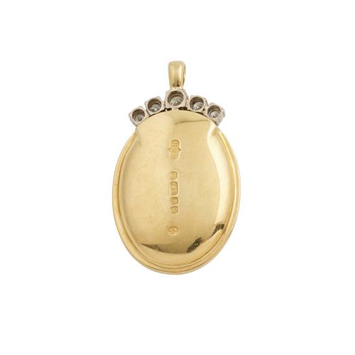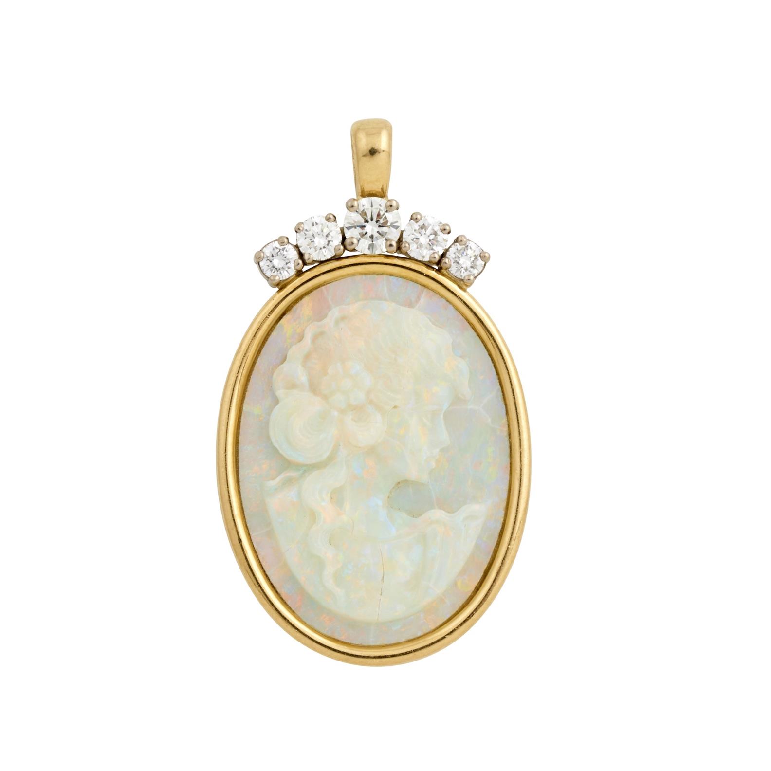 Centring a carved white opal cameo depicting the profile of a women, within a gold frame accented with brilliant-cut diamonds, the diamonds together weighing approximately 0.55 carats, mounted in 18ct gold, length 37mm, gross weight approximately 13.4 grams, signed HRS, London hallmarks.