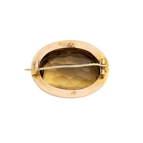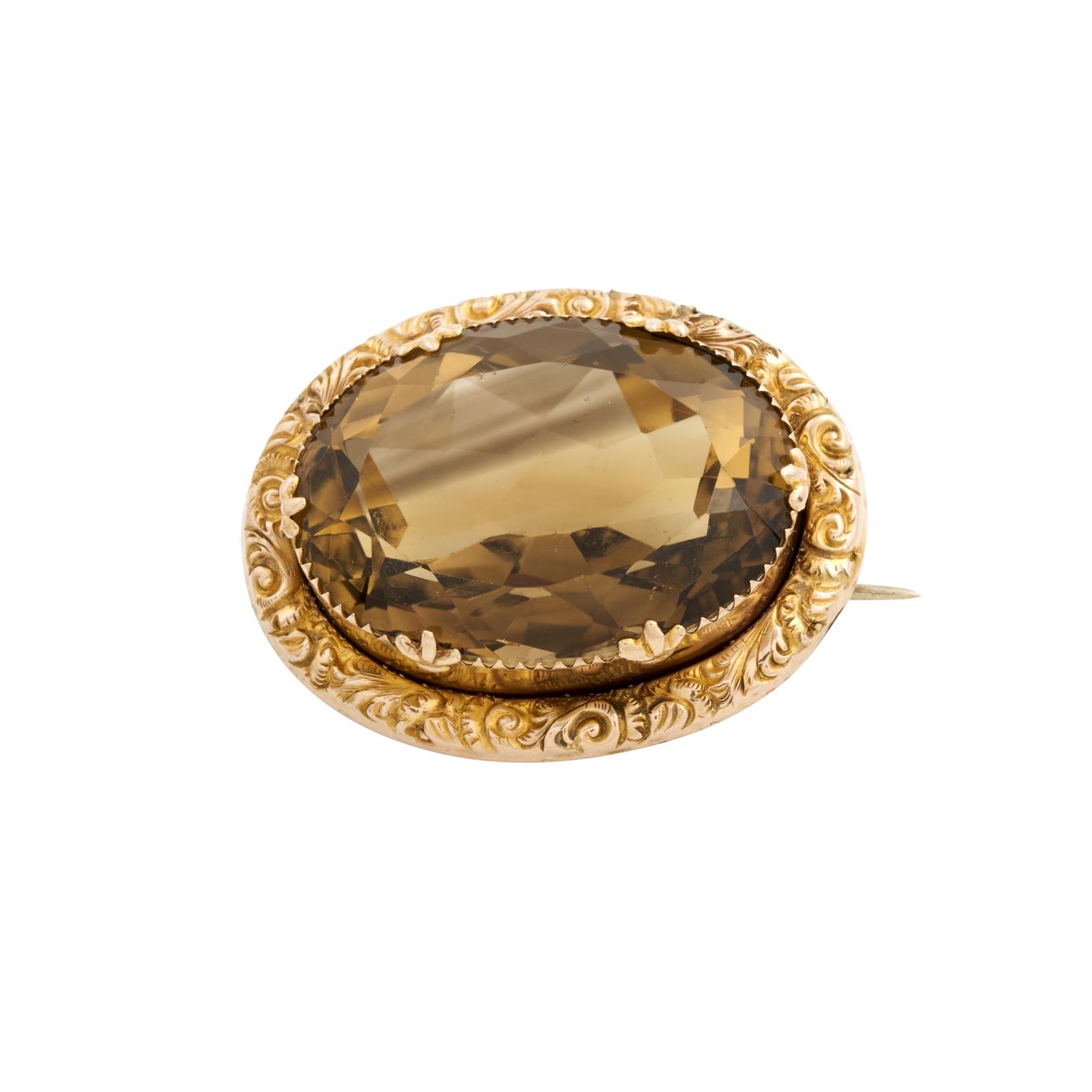 Centring a claw-set oval citrine measuring approximately 30mm x 24mm, mounted in 9ct gold, length 38mm, gross weight approximately 20.3 grams.