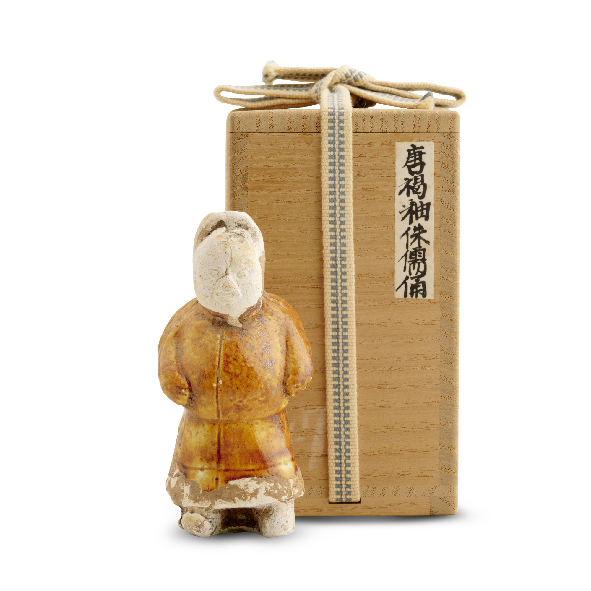 唐 黃釉侏儒俑 附日本木盒