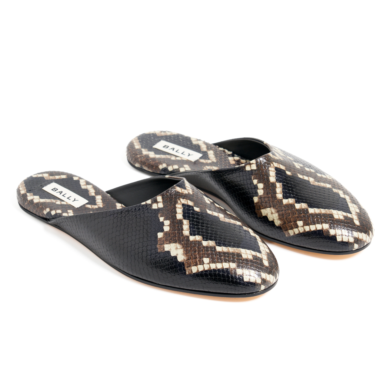 BALLY, A PAIR OF SLIDES FEATURING EBONY SNAKESKIN UPPER, LEATHER LINING AND SOLE, MARKED SIZE 42, ACCOMPANIED BY A BOX.