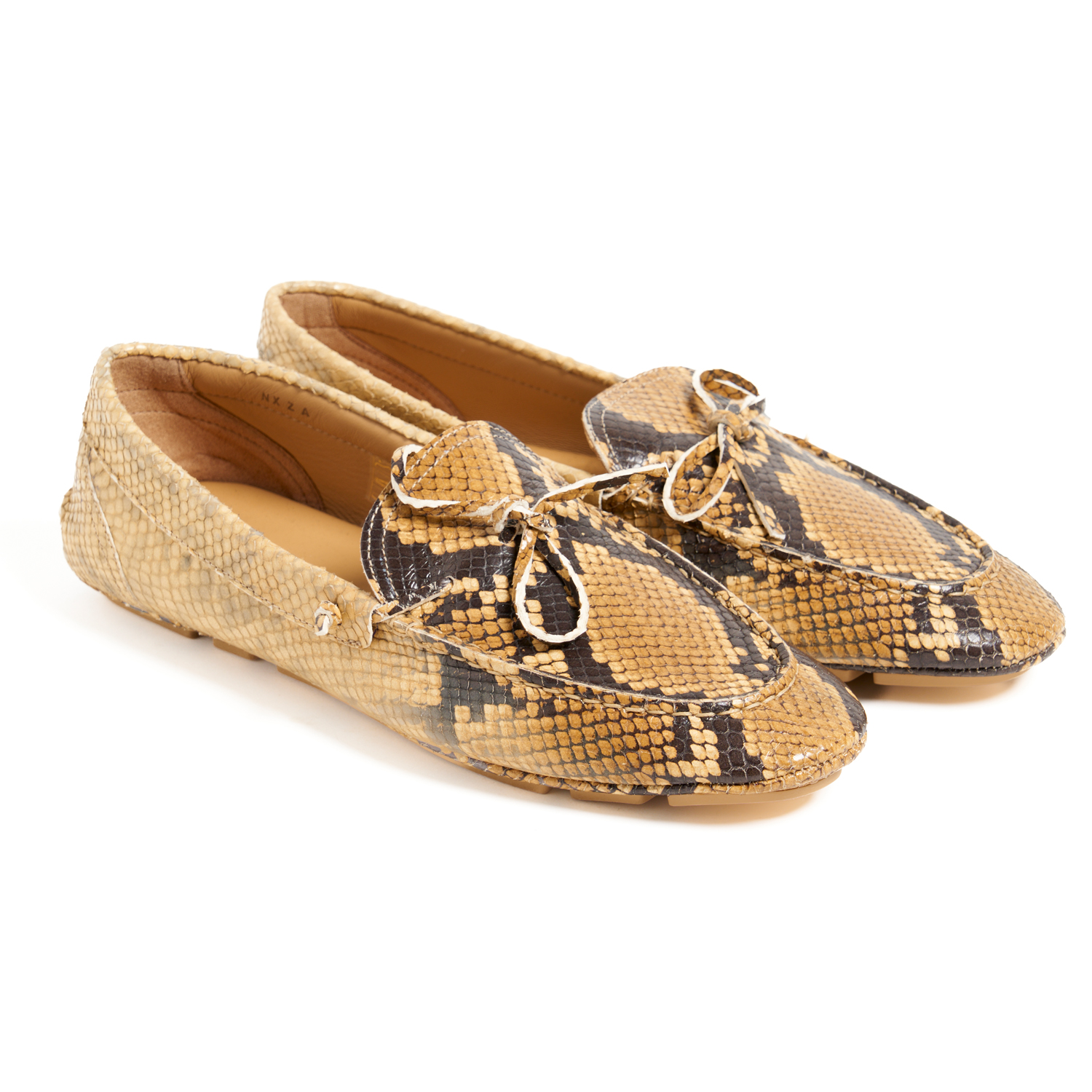 BALLY, A PAIR OF LOAFERS FEATURING SNAKESKIN UPPER WITH LEATHER STRING BOW DETAIL, MARKED SIZE 42 1/2, ACCOMPANIED BY A BOX.