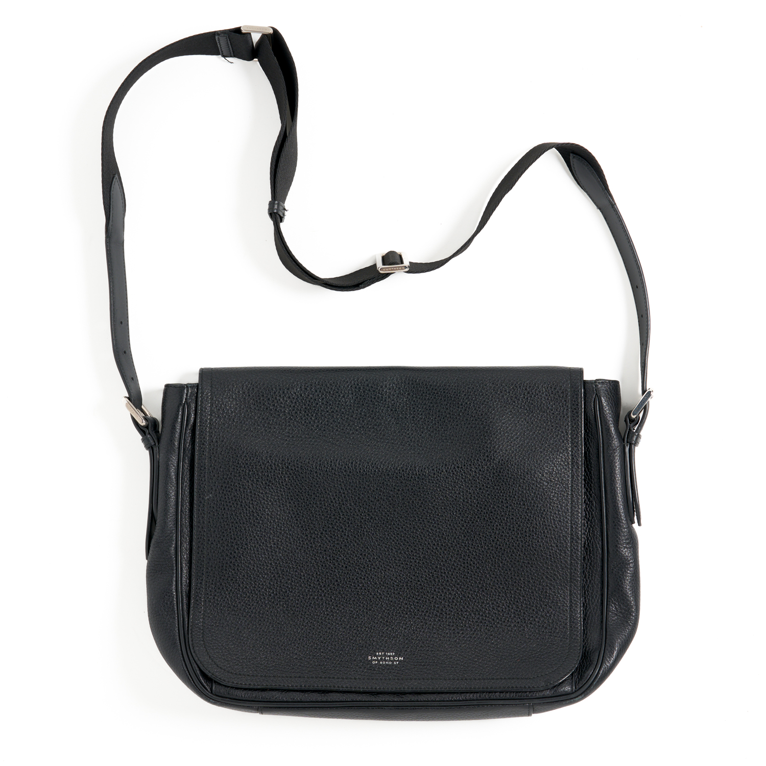 SMYTHSON, A SATCHEL STYLED IN BLACK LEATHER WITH BROWN SUEDE TRIM, FEATURING SILVER TONE HARDWARE AND ADJUSTABLE CROSSBODY STRAP, 28 X 37 X 7 CM.