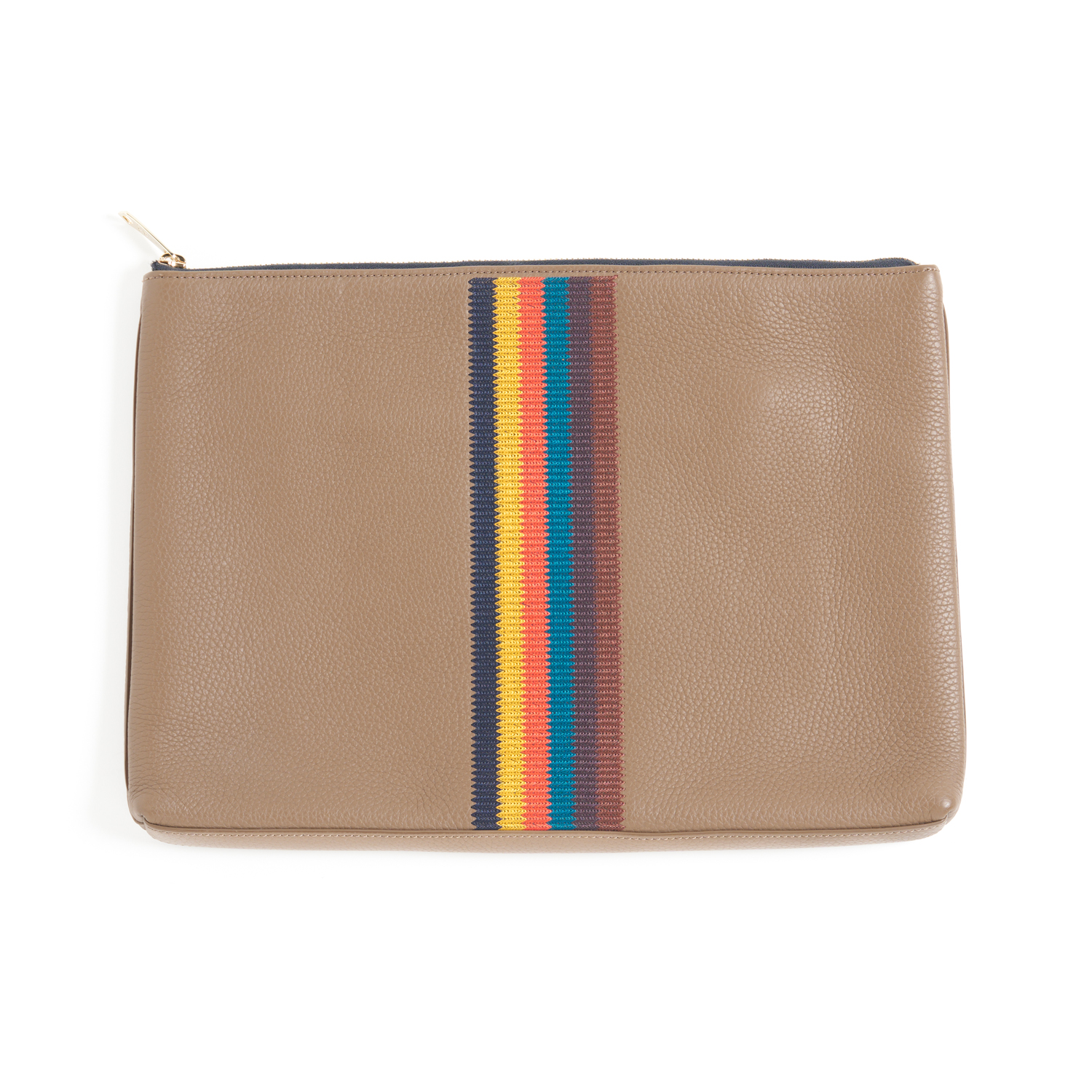 PAUL SMITH, A DOCUMENT HOLDER STYLED IN TAUPE LEATHER WITH GOLD TONE ZIP CLOSURE AND MULTICOLORED STITCHED BELTING DETAIL, 25 X 36 X 1.5 CM.