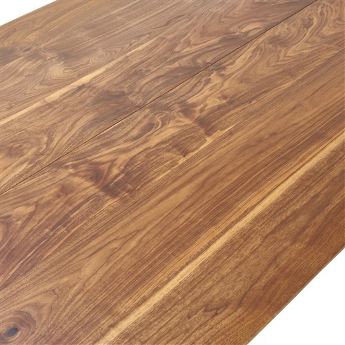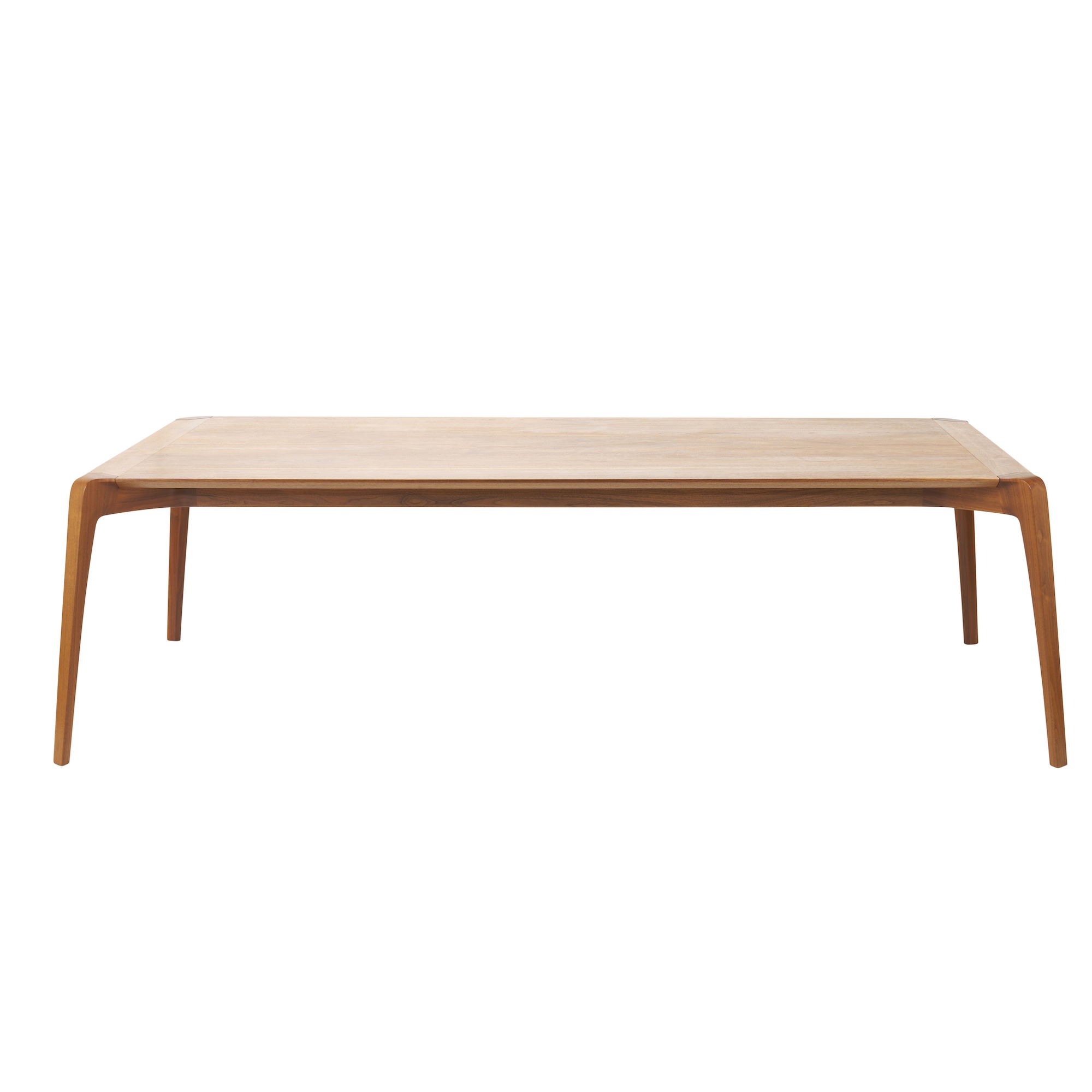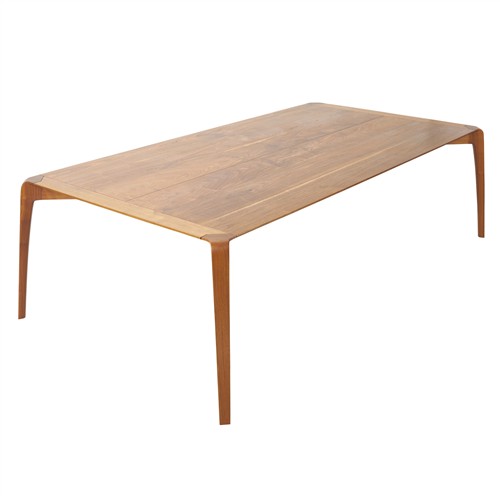In walnut with gently tapered legs and sculptural joinery detail to corners.