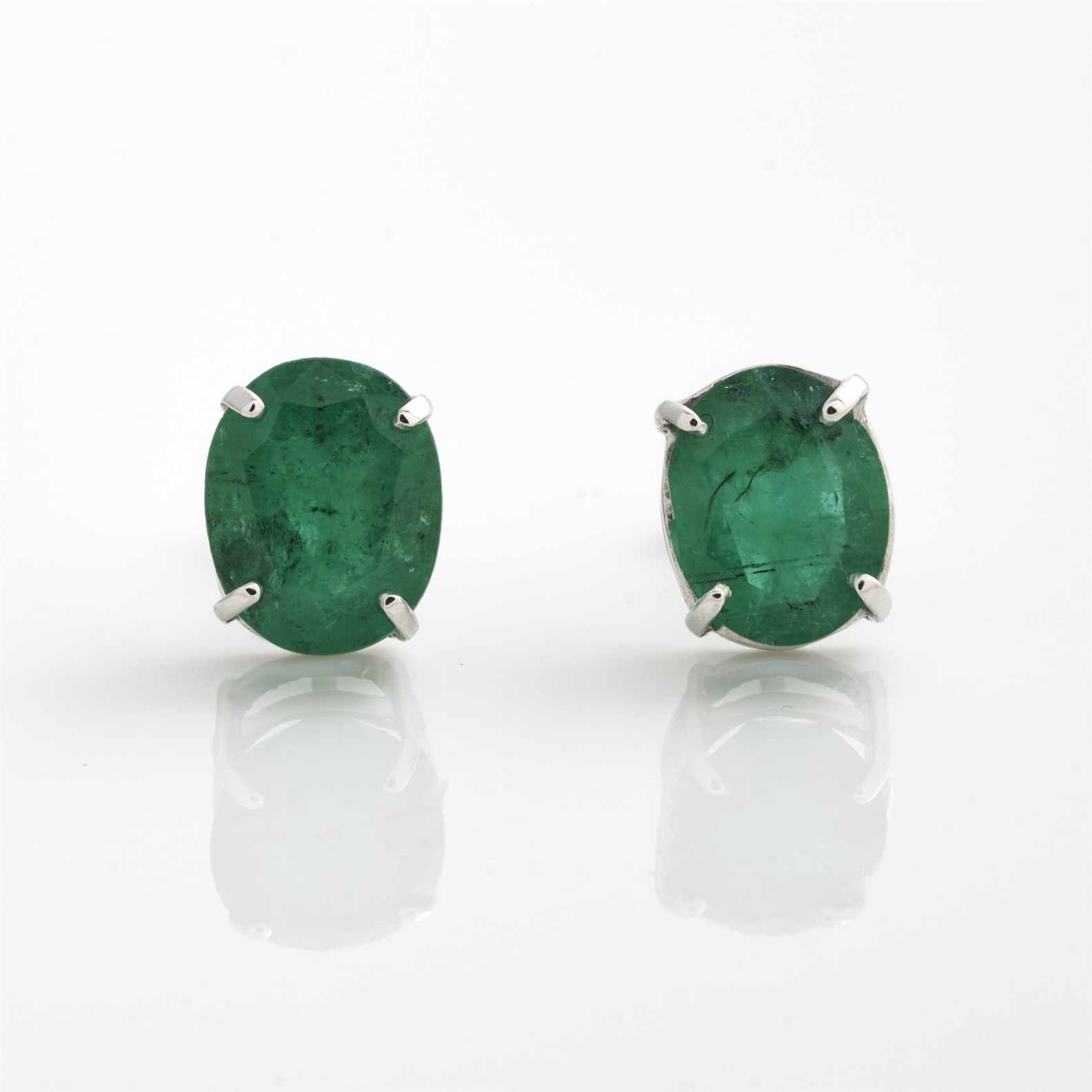 A PAIR OF EMERALD EARRINGS IN 18CT WHITE GOLD, THE EMERALDS TOTALLING 5.48CTS, TO POST AND BUTTERFLY FITTINGS, 3.8GMS
