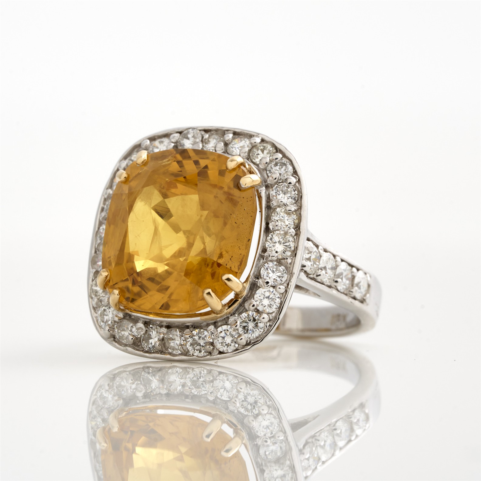 A YELLOW SAPPHIRE AND DIAMOND RING IN TWO-TONE 18CT WHITE GOLD, THE SAPPHIRE WEIGHING 11.75CTS, THE DIAMONDS TOTALLING APPROXIMATELY 1.32CTS, SIZE N, 10.9GMS, ACCOMPANIED BY A VALUATION