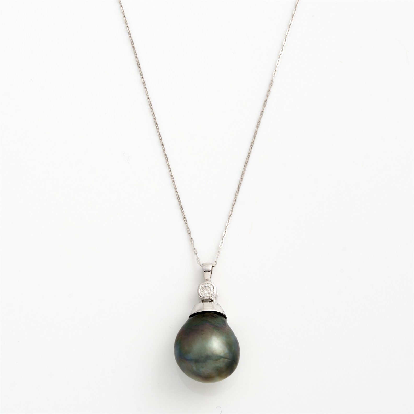 A TAHITIAN PEARL AND DIAMOND PENDANT NECKLACE IN 18CT WHITE GOLD, THE PEARL MEASURING APPROXIMATELY 22MM, THE CHAIN MEASURING 460MM, 11.3GMS