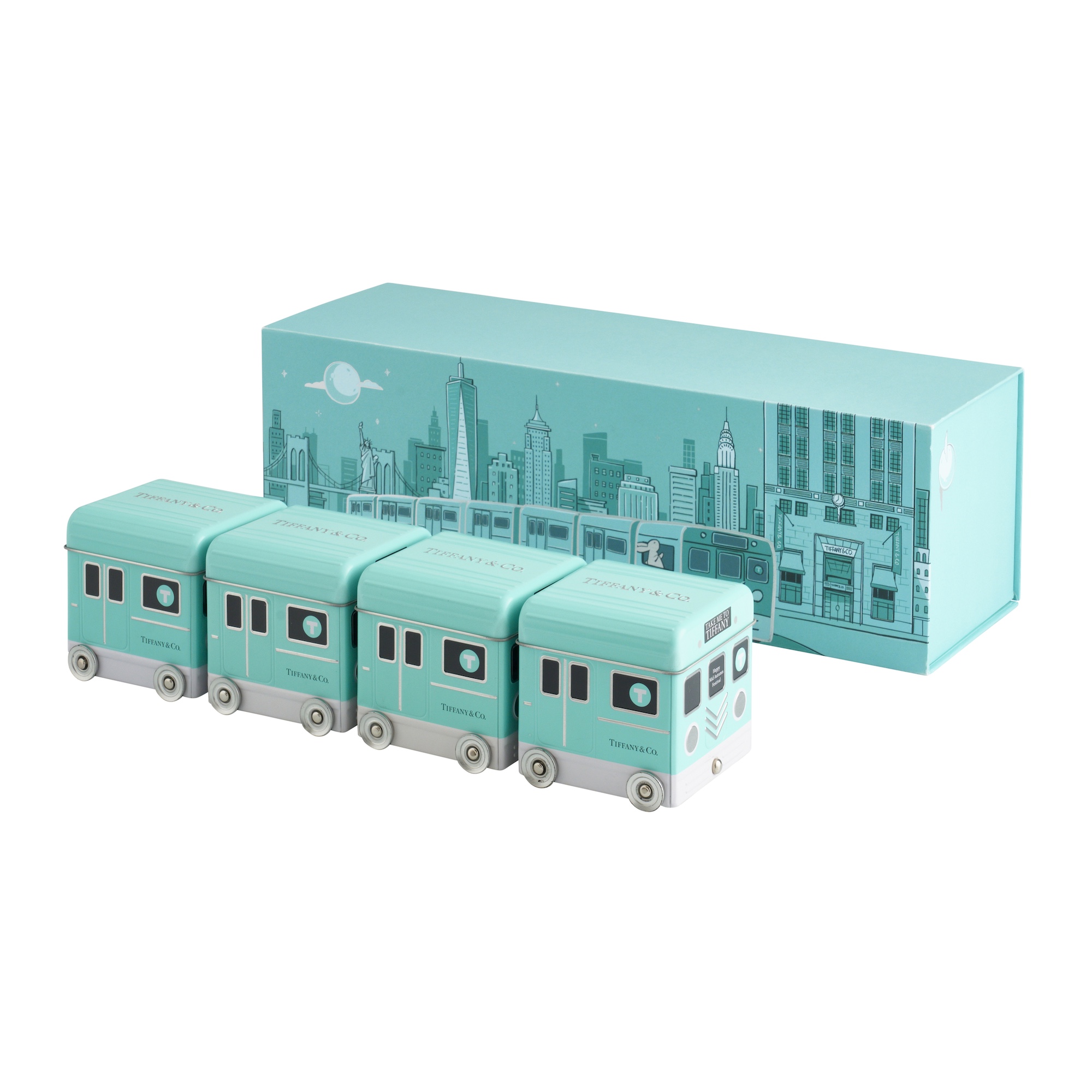 Comprising four tiffany blue tin boxes on wheels with train molding and decals, each measuring 8.5 cubed.