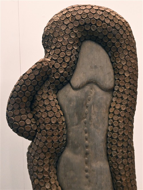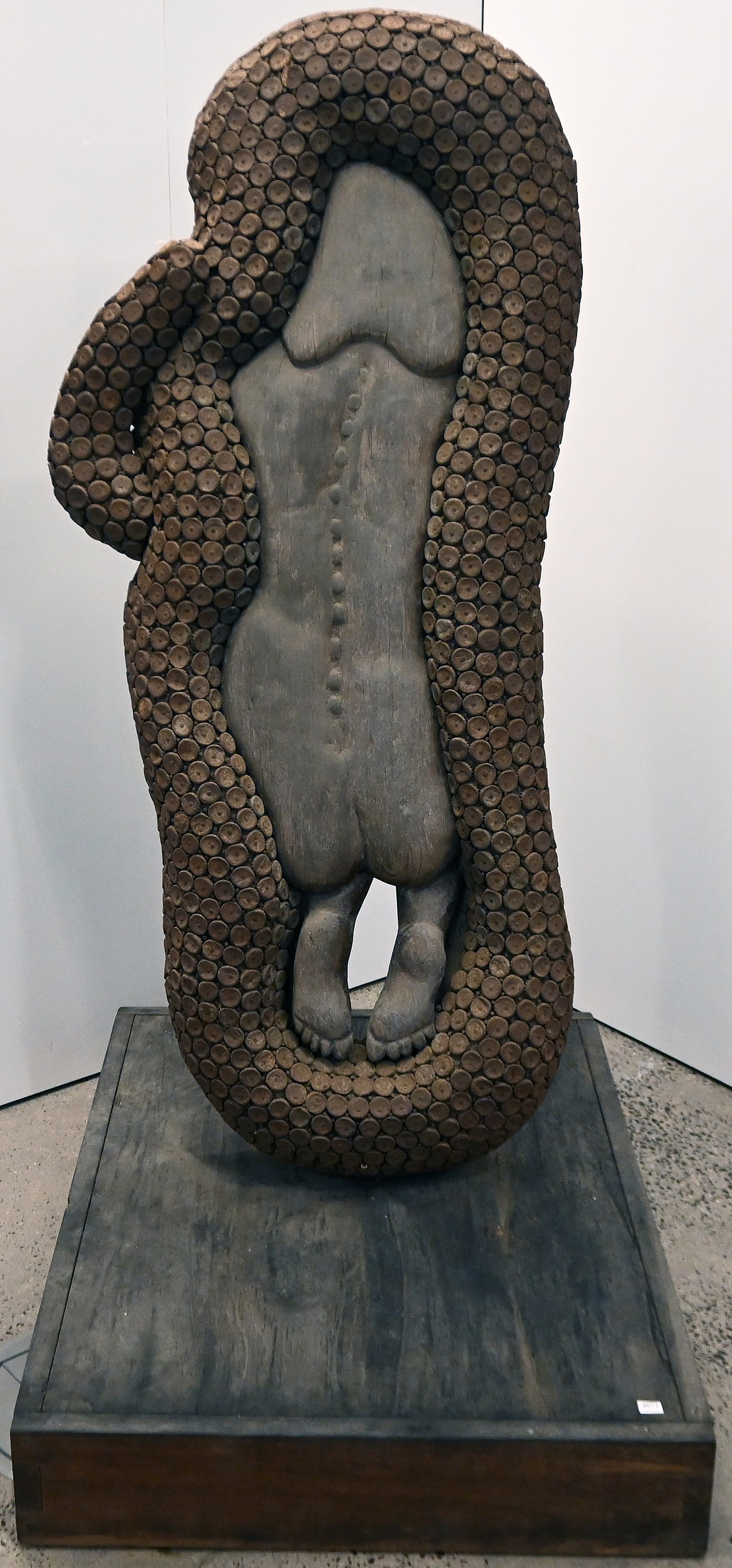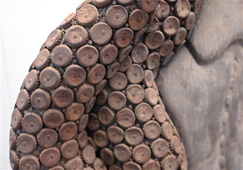 TIMBER AND BOTTLETOPS SCULPTURE, 162 X 75.5 X 100CM (INCLUDING BASE)