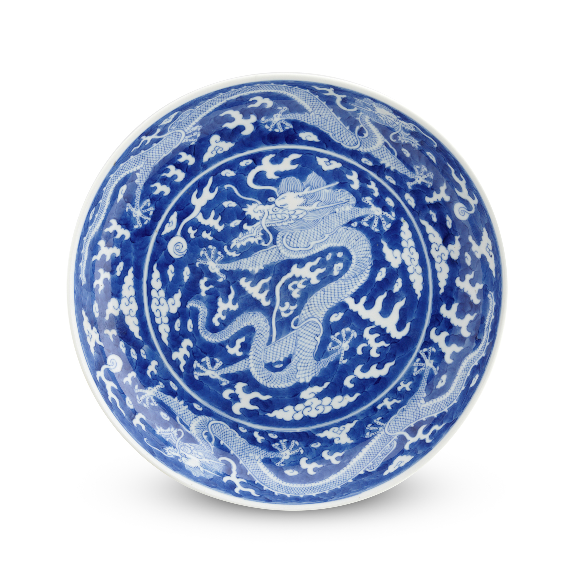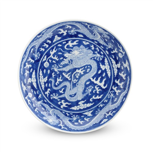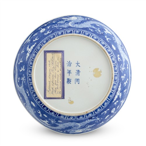 A CHINESE BLUE AND WHTIE 'DRAGON' DISH, TONGZHI UNDERGLAZE BLUE SIX-CHARACTER MARK AND OF THE PERIOD (1862-74)