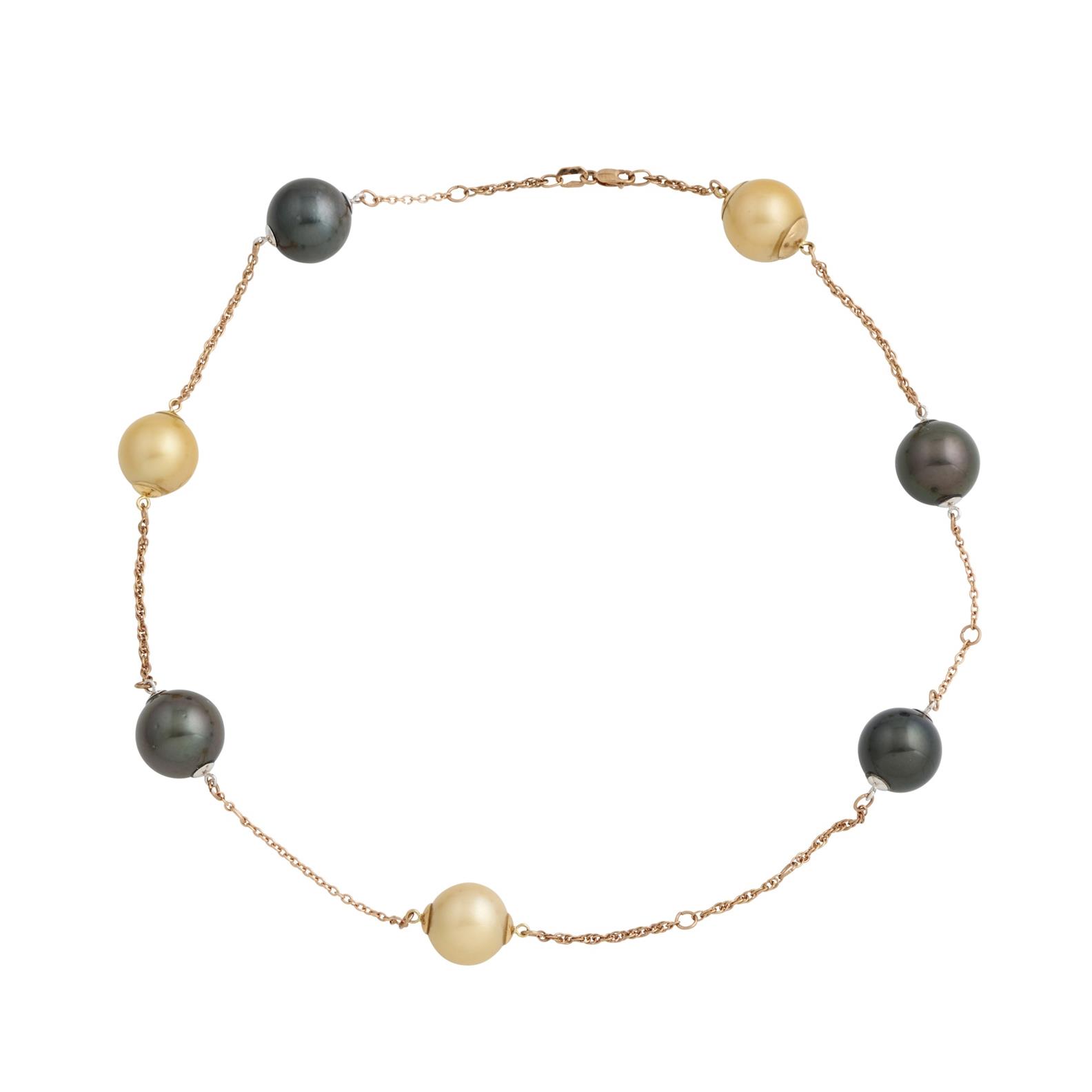 Designed as a continuous line of 7 cultured pearls alternating between trace and rope link chain connectors, mounted in 9ct rose gold, inner circumference 445mm, gross weight approximately 28.7 grams.